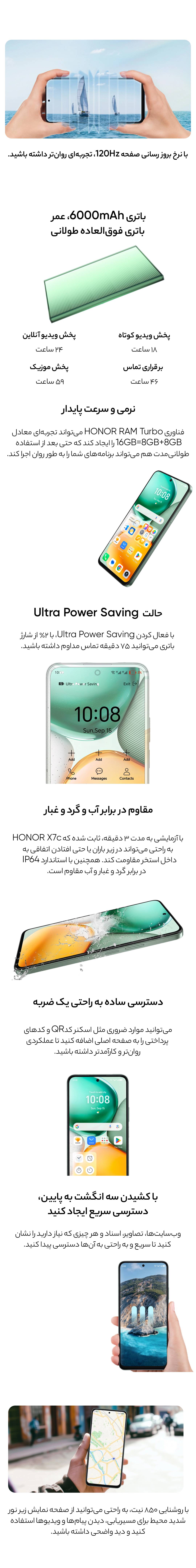 یکی از نقاط قوت آنر X7c ظرفیت بالای باتری آن است که با ظرفیت 6000 میلیآمپرساعتی عرضه میشود. این ظرفیت بالا تضمین میکند که دستگاه در شرایط استفاده متوسط تا سنگین میتواند بیش از یک روز شارژدهی داشته باشد. فناوری شارژ سریع 35 وات نیز از ویژگیهای کاربردی است که امکان شارژ سریعتر را فراهم میکند، هرچند در مقایسه با برخی از گوشیهای میانرده میتوانست شارژ سریعتری داشته باشد.