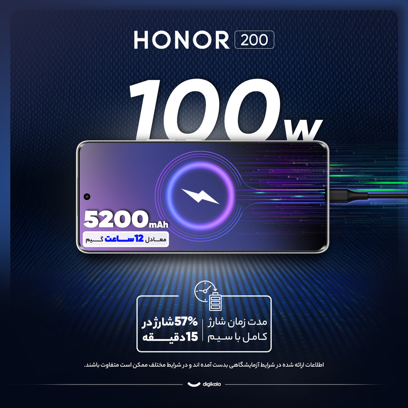همچنین گوشی آنر مدل ۲۰۰ از شارژ سریع 100 واتی پشتیبانی میکند که میتواند در مدت 15 دقیقه گوشی را تا ۵۷٪ شارژ کند. با این حال، این گوشی از شارژ بیسیم پشتیبانی نمیکند که ممکن است برای برخی کاربران نقطه ضعفی محسوب شود.