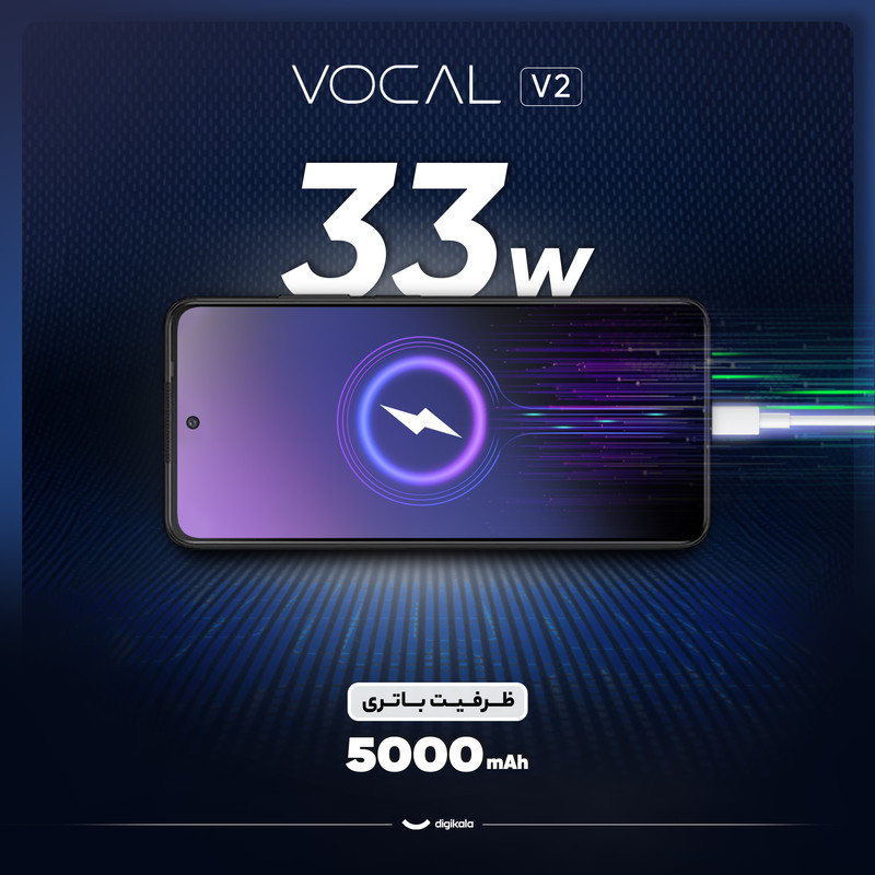 یکی از ویژگیهای برجستهVocal V2 ، باتری ۵۰۰۰ میلیآمپرساعتی آن است. این باتری به راحتی میتواند یک روز کامل استفاده سنگین را تحمل کند. همچنین با پشتیبانی از شارژ سریع ۳۳ وات، زمان شارژ شدن دستگاه کاهش مییابد و در مدت کوتاهی میتوانید گوشی را به طور کامل شارژ کنید. این گوشی با پشتیبانی از شبکه 4G، اتصالات پایداری ارائه میدهد. نسخه بلوتوث 5.0، GPS چندگانه و وایفای دو بانده از دیگر ویژگیهای ارتباطی این دستگاه هستند. حسگرهای متعددی از جمله ژیروسکوپ، مجاورت و سنجش نور محیط، تجربه کاربری بهتری برای کاربران فراهم میکنند.