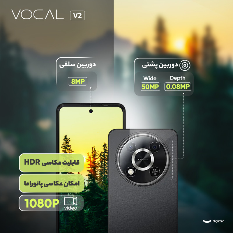 برند وکال یک برند اماراتی است که دفتر مرکزی آن در شهر دبی قرار دارد. گوشی Vocal V2 یکی از مدلهای اقتصادی جذاب در بازار کنونی است که با طراحی شیک، مشخصات کاربردی و قیمتی مقرونبهصرفه عرضه شده است. این دستگاه با ابعاد جمعوجور و قاب پشتی چرمی، ترکیبی از زیبایی و راحتی را به کاربران ارائه میدهد. نمایشگر ۶.۶ اینچی این گوشی با فناوری LED و نرخ بروزرسانی ۱۲۰ هرتز، تجربهای روان و لذتبخش را در استفاده روزمره فراهم میکند، هرچند که رزولوشن آن ۷۲۰x۱۶۱۲ پیکسل است. در بخش سختافزار، Vocal V2 به پردازنده Helio G99 و ۶ گیگابایت رم مجهز شده است که عملکردی سریع در اجرای اپلیکیشنها و بازیهای سبک دارد. قابلیت افزایش مجازی رم تا ۶ گیگابایت و حافظه داخلی ۱۲۸ گیگابایتی با استاندارد UFS 2.2 از دیگر مزایای این گوشی است که کاربری روانتری ارائه میدهد. در بخش دوربین، یک دوربین عریض ۵۰ مگاپیکسلی این دستگاه با قابلیتهایی همچون عکاسی پرتره، HDR و حالت شب، کیفیت تصاویر خوبی ارائه میدهد و برای یک گوشی اقتصادی کاملا مناسب است. از طرفی دوربین سلفی ۸ مگاپیکسلی نیز برای تماسهای ویدیویی و عکسهای روزمره مناسب است. Vocal V2 به یک باتری ۵۰۰۰ میلیآمپرساعتی مجهز شده است که امکان شارژ سریع ۳۳ واتی دارد و نیازهای کاربران را در طول یک روز به طور کامل تأمین میکند. در مجموع این گوشی برای افرادی که به دنبال عملکرد قابل قبول و امکانات متنوع در یک مدل اقتصادی هستند، انتخابی عالی است.