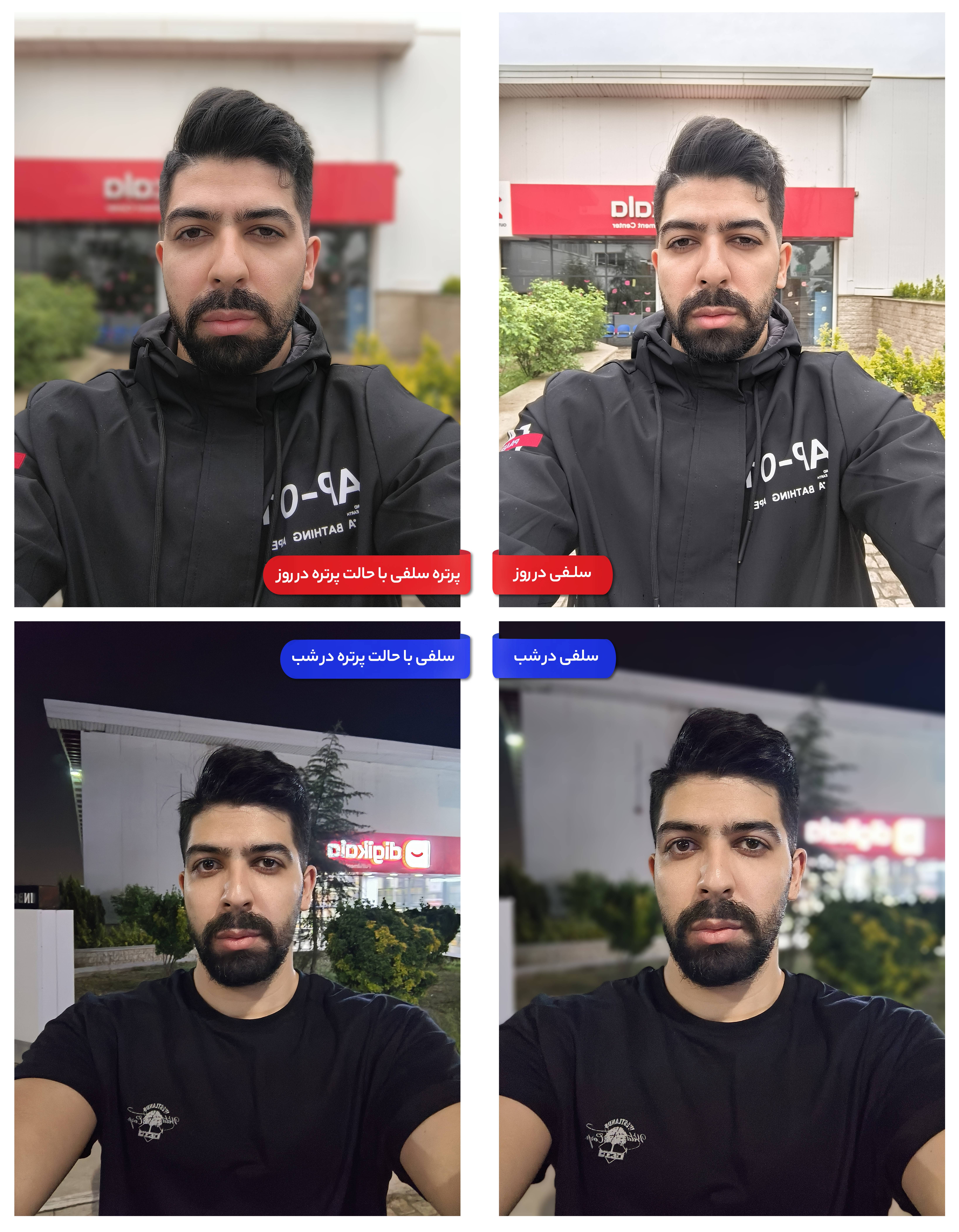 دوربین سلفی در بالای صفحه نمایش به صورت پانچ هول تعبیه شده است تا حداقل فضا را از صفحه نمایش اشغال کند. این دوربین سلفی رزولوشن بینظیر 32 مگاپیکسلی دارد و به خوبی جزییات صورت و تناژ پوستی را در حالت طبیعی حفظ میکند. همانطور که در تصاویر مشاهده میکنید، سلفیهای ثبت شده با آن در نور شب هم کیفیت بالایی دارند.