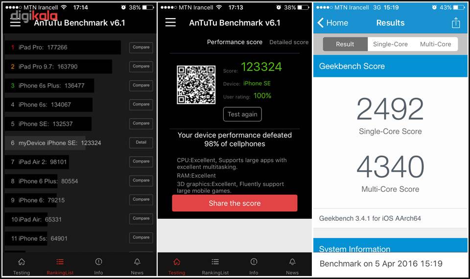 سریع، روان، قدرتمند؛ صفاتی هستند که میتوان هنگام توصیف سختافزار و کارایی آیفون SE از آنها استفاده کرد. استفاده از پردازندهی قدرتمند A9 بدون هیچ تغییری در مقایسه با آیفون 6s، از این گوشی یک غول سختافزاری ساخته که میتواند هرگونه عملیاتی را بهراحتی انجام دهد؛ بدون اینکه به کیت خنککننده احتیاج داشته باشد یا در انجام این عملیات مکث یا کموکسری احساس کنید. همچنین وجود دو گیگابایت رم باعث شده همهی منوها، بازیها، تنظیمات یا برنامههای پیشفرض بسیار روان و راحت اجرا شوند.