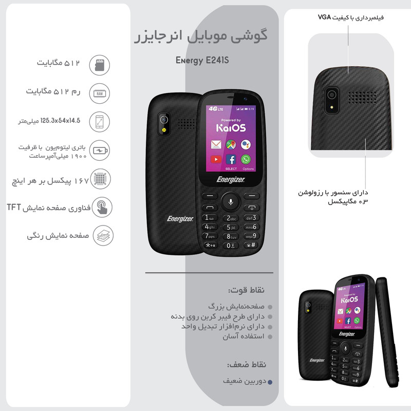 گوشی موبایل «Energy E241S» محصولی از شرکت انرجایزر (Energizer) است که با طراحی گوشیهای کلاسیک روانه بازار شده است. انرجایزر در طراحی ویژهی Energy E241S صفحهکلیدی قرار داده که تایپ و ارسال پیامک بهوسیله آن بسیار آسان خواهد بود؛ این صفهکلید امکان تایپ فارسی را هم فراهم میکند. همچنین این محصول از دو سیمکارت پشتیبانی میکند. گوشی Energy E241S به نمایشگری 2.4 اینچی مجهز شده که از نوع LCD است و در ساخت آن از فناوری TFT بهره گرفته شده است. از دیگر ویژگیهای این محصول انرجایزر میتوانیم به بلوتوث نسخهی 2.1 و رادیو FM اشاره کنیم. برخلاف بسیاری از محصولات کلاسیک، در Energy E241S دوربین سلفی وجود دارد و روی قاب پشتی آن سنسوری از نوع VGA نقش دوربین اصلی را ایفا میکند. علاوه بر این گوشی موبایل Energy E241S از فناوری بلوتوث، Wi-Fi و شبکه های نسل چهارم پشتیبانی می کند. گفتنی است که تمام این سختافزار توسط یک باتری پرقدرت لیتیوم یونی با ظرفیت 1900 میلیآمپرساعت تغذیه میشود.
