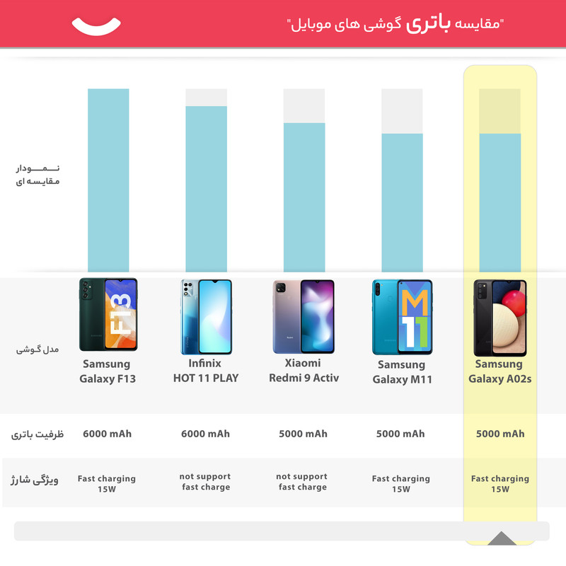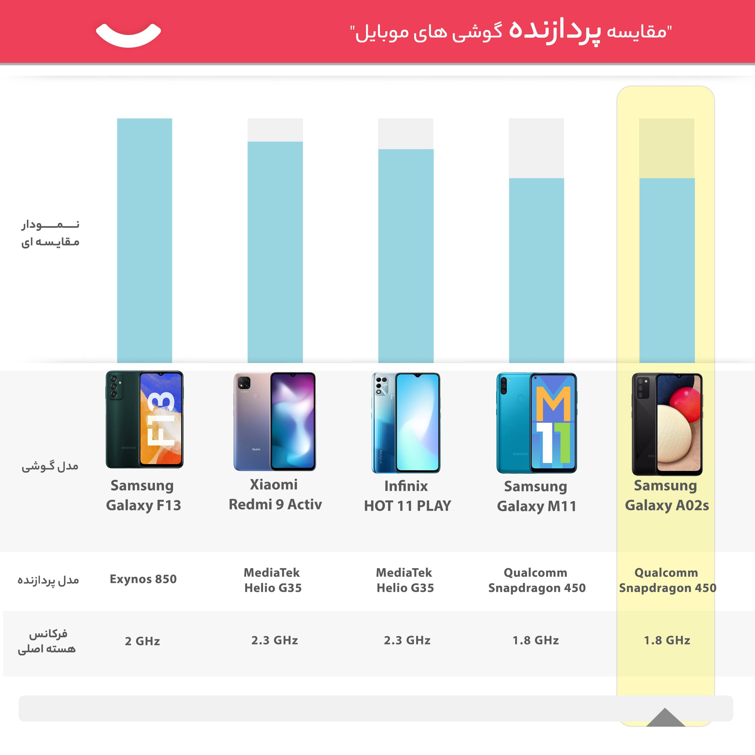این گوشی هوشمند میانرده به پردازنده اسنپدراگون 450 شرکت کوالکام مجهز شده است. پردازندهای با معماری 14 نانومتری که هسته اصلی آن توانایی ارائه حداکثر فرکانس کاری 1.8 گیگاهرتز را دارد. با توجه به مشخصات هسته این پردازنده و حضور پردازنده گرافیکی Adreno 506 باید بگوییم که سامسونگ گلکسی A02s از پس فعالیتهای روزمره و همچنین بازیهای سبک بهخوبی بر میآید و بازیهای سنگین را هم در تنظیمات گرافیکی low میتواند اجرا کند. سری A گوشیهای هوشمند میانرده سامسونگ همواره از باتریهای قدرتمندی بهره بردهاند. گلکسی A02s هم از این اتفاق مستثنی نیست و به باتری با میزان ظرفیت 5000 میلیآمپرساعت مجهز شده است. گلکسی A02s با بهره بردن از چنین باتری میتواند به ازای هر بار شارژ 100 درصدی طول عمر مفید (زمان آماده بهکار) 114 ساعت برای حالت استندبای، 34 ساعت و 5 دقیقه برای مکالمه صوتی، 16 ساعت و 29 دقیقه برای وب گردی و 16 ساعت و 3 دقیقه برای حالت پخش ویدیو را ارائه کند.