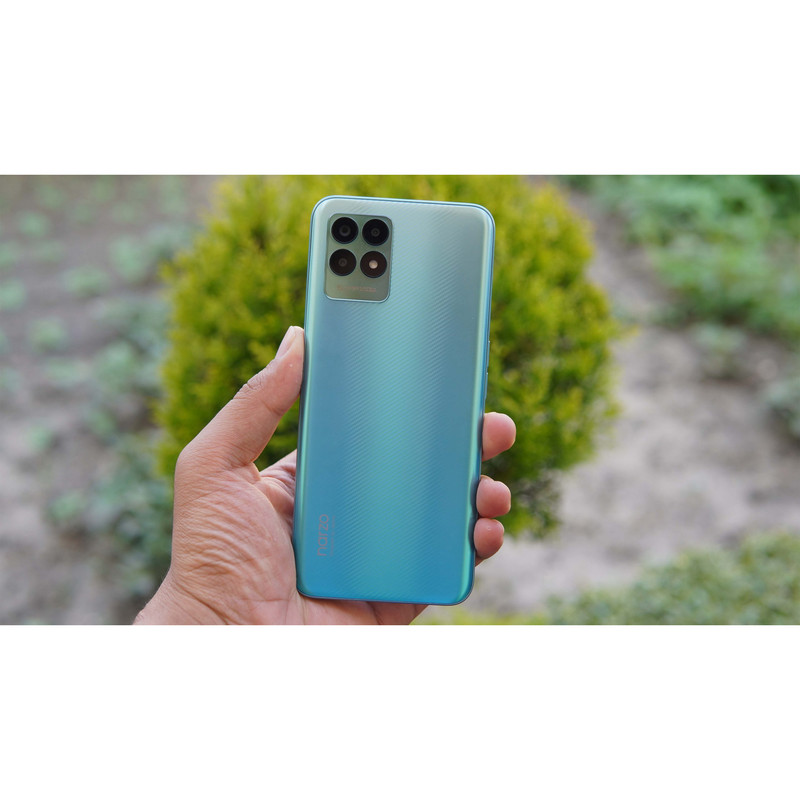 با تمام این تفاسیر باید بگوییم که 84.6 درصد از نمای روبهرویی را صفحهنمایش به خودش اختصاص داده است و در حین کار کردن چندان حاشیههای صفحهنمایش به چشم نمیآیند. وزن مناسب 194 گرمی این گوشی هم سبب شده تا در استفاده طولانی مدت چندان خستگی برای دست شما بههمراه نداشته باشد. برای فریم کناری و قسمت پشتی از متریال پلاستیکی باکیفیت برای این گوشی استفاده شده و با توجه به طراحی در نظر گرفته شده باید بگوییم که ریلمی Narzo 50 حس و حال استفاده از یک گوشی میانرده باکیفیت را به شما میدهد.