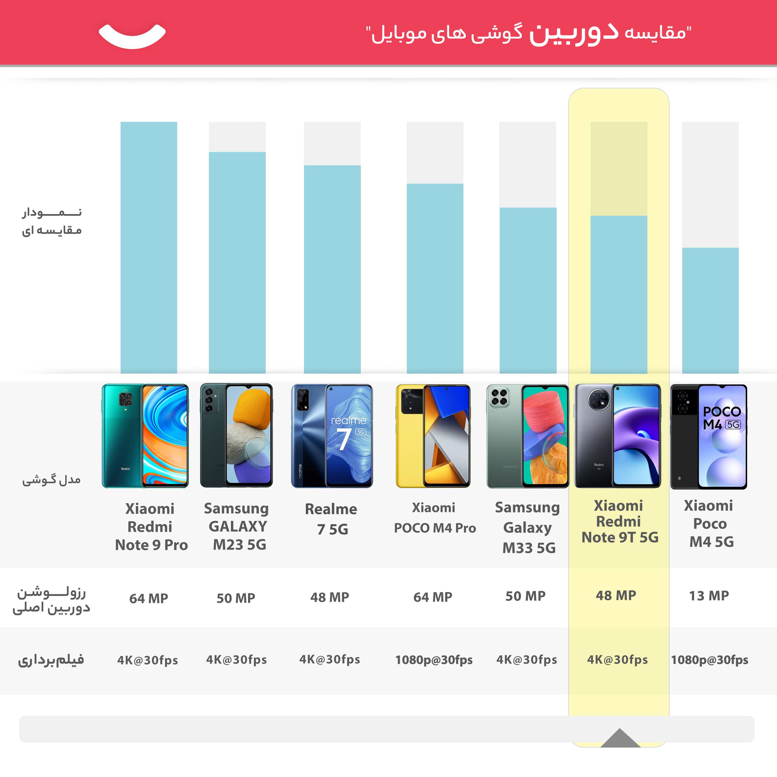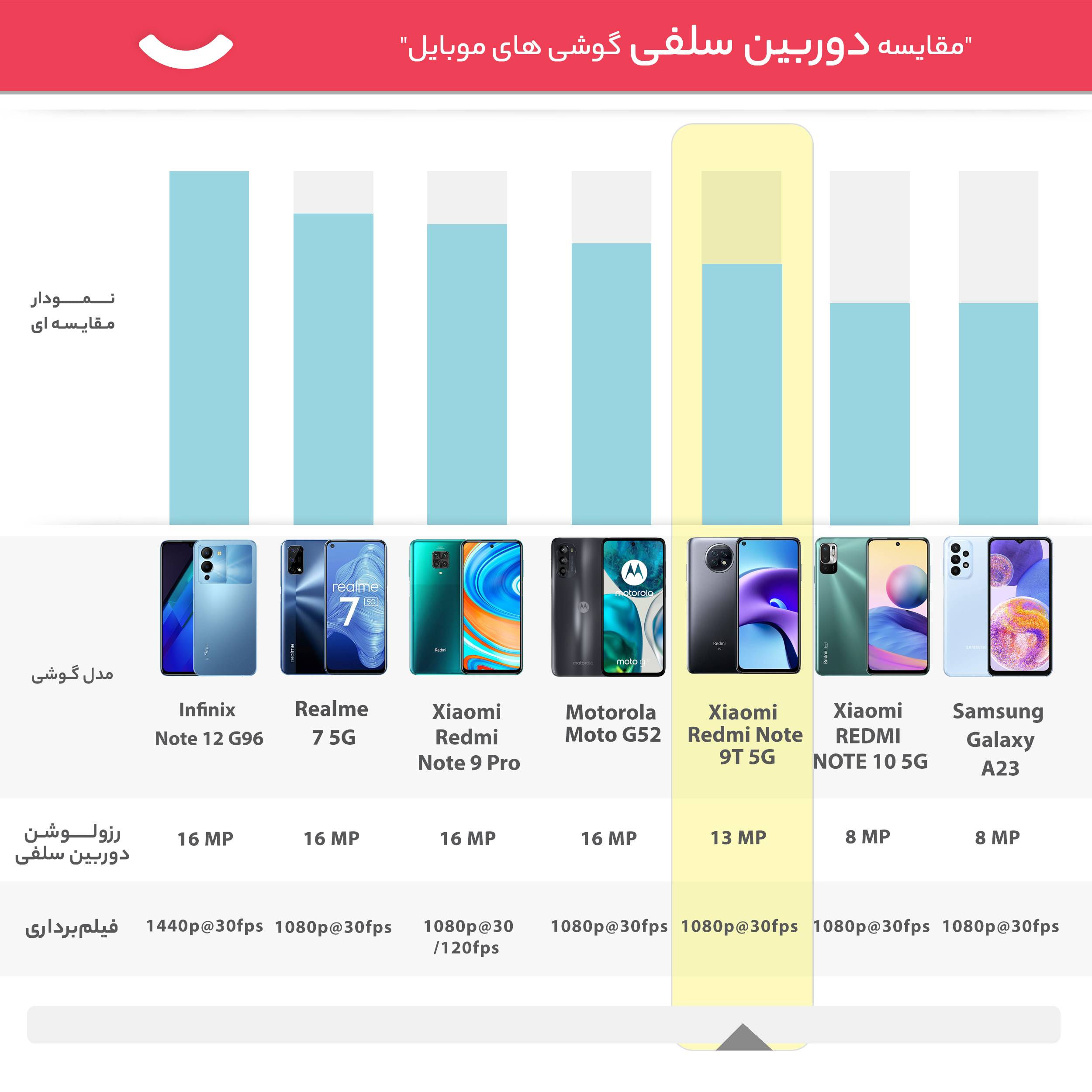 گوشی موبایل شیائومی مدل Redmi Note 9T 5G M2007J22G دو سیم کارت ظرفیت 64 گیگابایت از سری گوشیهای باکیفیت این برند است که میتواند تمامی اکثر نیازهای ما مانند وبگردی، بازی آفلاین و آنلاین، تماشای فیلم و کلیپ، شبکههای اجتماعی، کار با اپلیکیشن و بسیاری دیگر را انجام دهید. گفتنی است که این گوشی با تمامی قابلیتهایی که دارد، یک گوشی میانرده است که به فناوری 5G مجهز شده است. یکی از ویژگیهای این گوشی باتری آن است. مهندسان شیائومی برای گوشی Redmi Note 9T باتری لیتیوم-پلیمری با ظرفیت 5000 میلیآمپرساعت در نظر گرفتهاند که باتوجه به ظرفیت آن، عمر مطلوبی هم دارد. که امکان شارژ سریع 18 وات را برایتان فراهم میکند. از این گوشی میتوانید استفادههای بسیار متنوع و باکیفیتی در عکاسی داشته باشید. پردازنده مرکزی (CPU) و پردازنده گرافیکی (GPU) این گوشی بهاندازهای قدرت دارند که میتوانید بدون هیچ گونه دغدغه و کاهش سرعت برنامههای محاسباتی و عملیاتی را اجرا کنید. این گوشی دارای 64 گیگابایت حافظه داخلی و 4 گیگابایت حافظه RAM رم است. گوشی شیائومی Redmi Note 9T دارای دوربین سهگانه در پشت گوشی بوده که با کیفیتهای 48، 2 و 2 مگاپیکسل است که هرکدام دارای کارایی و استفادهای متفاوتی در نوع عکاسیهای هستند. دوربین عکاسی سلفی Redmi Note 9T دارای لنز عریض (Wide) با رزولوشن 13 مگاپیکسل است که تصاویر مطلوبی برای استفاده در شبکههای اجتماعی و ویدئوهای رضایتبخشی برای مکالمه تصویری ایجاد میکند.