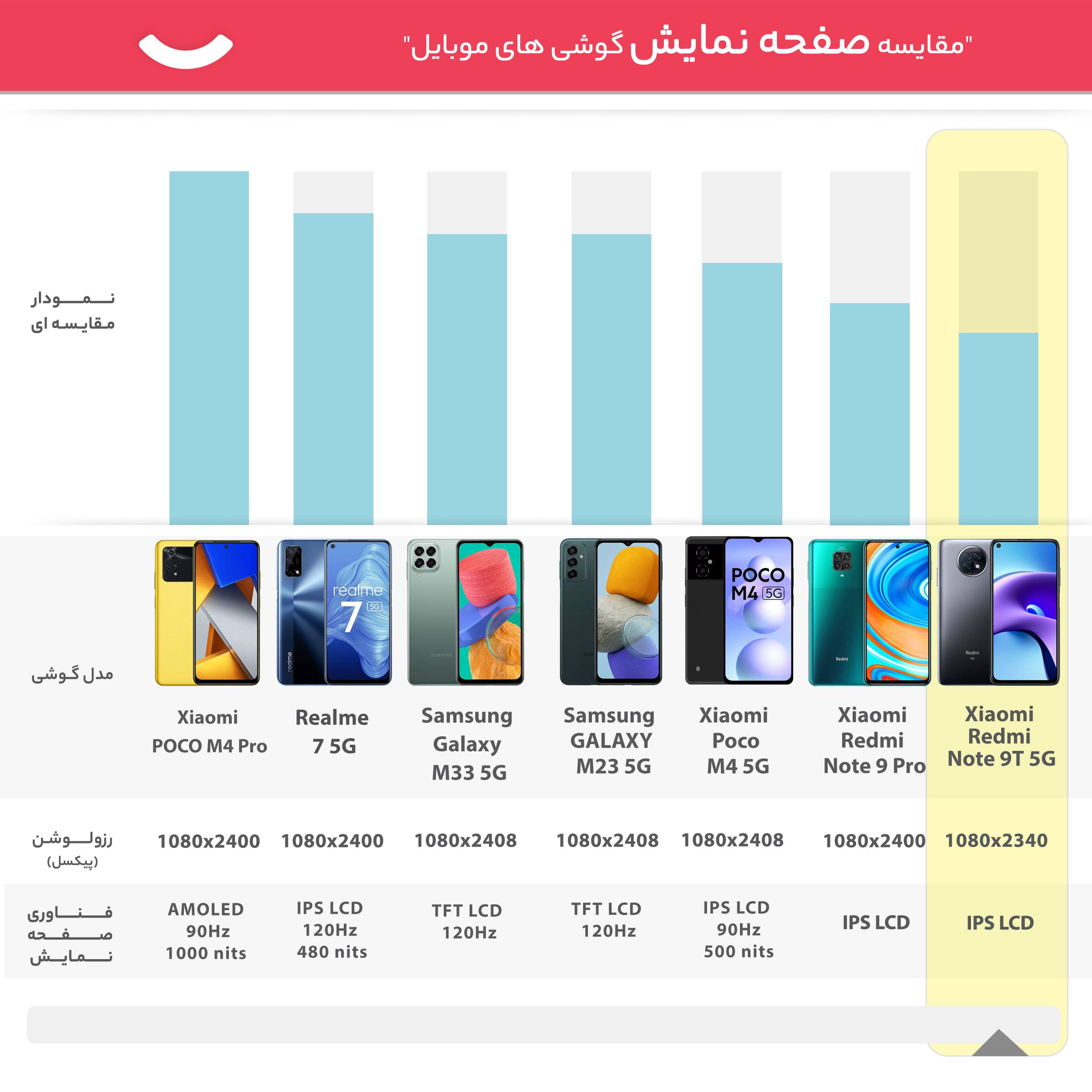 Redmi Note 9T 5G به صفحهنمایش 6.53 اینچ با رزولوشن 1080×2340 پیکسل از نوع IPS LCD مجهز شده است. این صفحهنمایش در هر اینچ توانایی ارائه 395 پیکسل را دارد. تا اینجا باید گفت که صفحهنمایش این گوشی هوشمند میانرده رزولوشن بسیار خوب و تراکم پیکسل مناسبی را با خود بههمراه دارد. همین مشخصات نشان از آن دارد که صفحهنمایش Redmi Note 9T 5G به نسبت میانرده بودن این گوشی هوشمند، عملکرد بسیار خوبی دارد. توانایی ارائه حداکثر روشنایی 450 نیت (شمع در متر مربع) هم باعث شده تا در شرایط نوری متنوع وضوح تصویر خوبی را شاهد باشید، هرچند زیر تابش مستقیم نور خورشید، کمی وضوح تصاویر کم میشود اما باز هم قابل خواندن و دیده شدن است. گوریلا گلس نسل پنجم (Corning Gorilla Glass 5) هم از صفحهنمایش این گوشی هوشمند در برابر افتادنها و ضربات احتمالی محافظت میکند. نزدیک به 84 درصد از نمای روبهرویی را صفحهنمایش به خودش اختصاص داده است و در مجموع باید بگوییم، Redmi Note 9T به عنوان یک گوشی میان رده، به صفحهنمایش یکدست، زیبا و باکیفیتی مجهز شده است که در این بخش نمره قابل قبولی میگیرد.