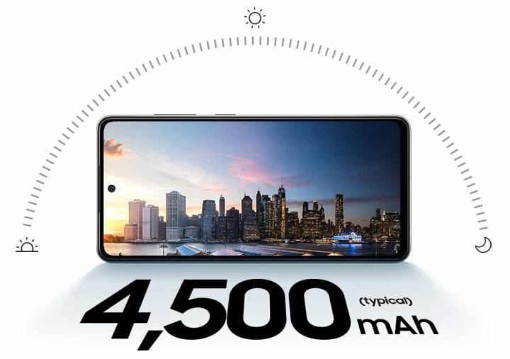 گوشی موبایل سامسونگ مدل A52 5G SM-A526B/DS دو سیمکارت ظرفیت 128 گیگابایت و رم 8 گیگابایت هم از باتری پرقدرت 4500 میلیآمپرساعت استفاده کرده است. این باتری جنس لیتیومپولیمر بوده که در مقایسه با گوشی موبایل A51 که از باتری با 4000 میلیآمپرساعت با جنس لیتیومیونی است، از ظرفیت بیشتری بهره برده و کیفیت و طولعمر بیشتری دارد.