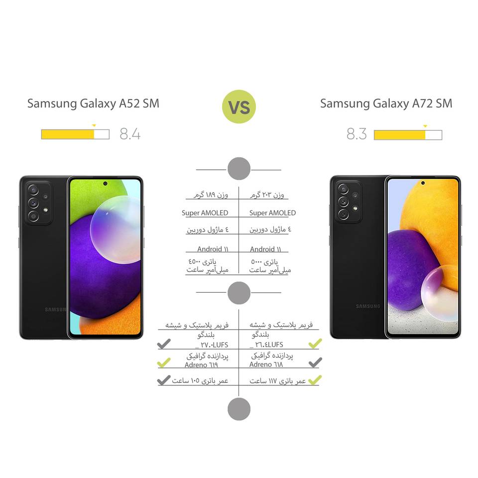 این نسخه از گوشی موبایل Galaxy A52 با رم 8 گیگابایتی و حافظه داخلی 128 گیگابایت به عنوان یکی از جدیدترین میانردههای سامسونگ روانه بازار شده است. این محصول دارای صفحهنمایش سوپر آمولد است و ظاهر زیبایی دارد. سامسونگ تلاش کرده است حاشیه را در این تولید جدید خود تا حد امکان کم کند. این گوشی قاب پشتی از جنس پلاستیک دارد و قاب جلویی آن را شیشه پوشانده که البته جلوهی زیبایی به گوشی داده است. این محصول سامسونگ با نسخه 11 از سیستمعامل اندروید روانه بازار شده است تا از هر نظر گوشی مدرن بهحساب بیاید. صفحهنمایش استفادهشده در این گوشی 6.5 اینچ با رزولوشن FullHD+ است که با استفاده از فناوری Super AMOLED و پنل OLED تصاویر شفاف و بینظیری را به نمایش میگذارد. این صفحهنمایش در هر اینچ 407 پیکسل را نشان میدهد که این یعنی جزئیات و وضوح تصویر عالی است. همچنین روکش این نمایشگر لایهی محافظ Corning Gorilla Glass است که از خطوخش و ضربه جلوگیری میکند. تراشهی این محصول، Snapdragon 750G از تراشههای 8 نانومتری سامسونگ است که به همراه 8 گیگابایت رم عرضه میشود. تراشهی گرافیکی Adreno 619 هم برای پخش ویدئو و بازی مناسب است. این نسخه از گوشی با حافظه 128 گیگابایتی عرضه شده است. دوربین اصلی A52 سنسور 64 مگاپیکسلی دارد و از نوع عریض (Wide) است. یک سنسور 12مگاپیکسلی و دو سنسور 5 دیگر هم در کنار این دوربین اصلی مجموعه دوربینهای قاب پشتی A52 را تشکیل دادهاند. دوربین سلفی 32مگاپیکسلی هم در قاب جلویی این گوشی به کار گرفته شده است. باتری 4500 میلیآمپرساعتی، پشتیبانی از فناوری شارژ سریع 25 واتی، درگاه USB Type-C و حسگر اثرانگشت در زیر قاب اصلی هم از دیگر ویژگیهای این تازهوارد است. سامسونگ در ساخت این گوشی از جدیدترین فناوریهای ساخت گوشی استفاده کرده است تا میانردهای با قابلیتهای نزدیک به یک بالارده خوشساخت را روانه بازار کند.
