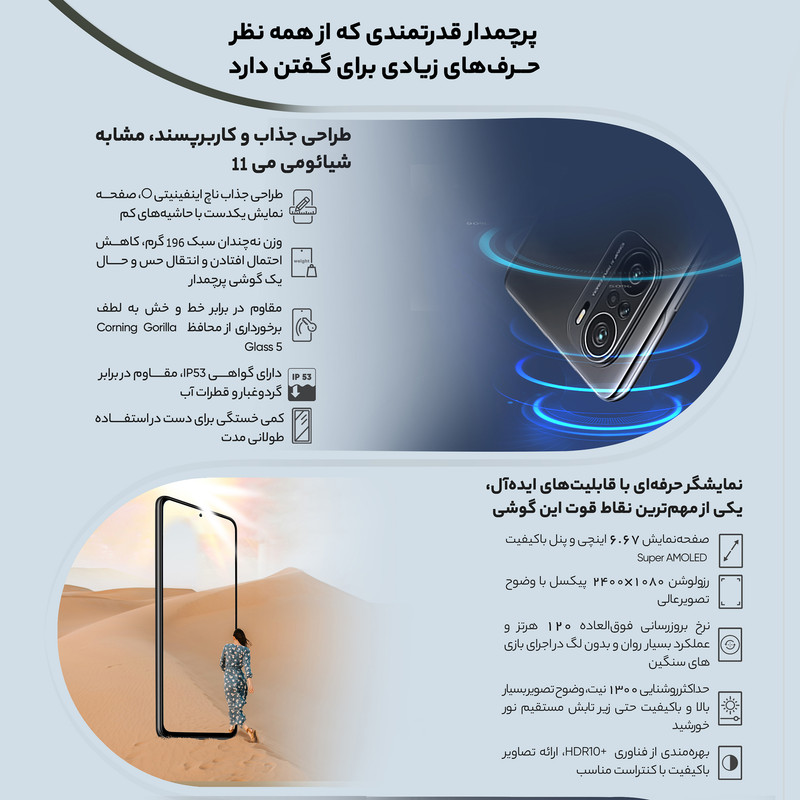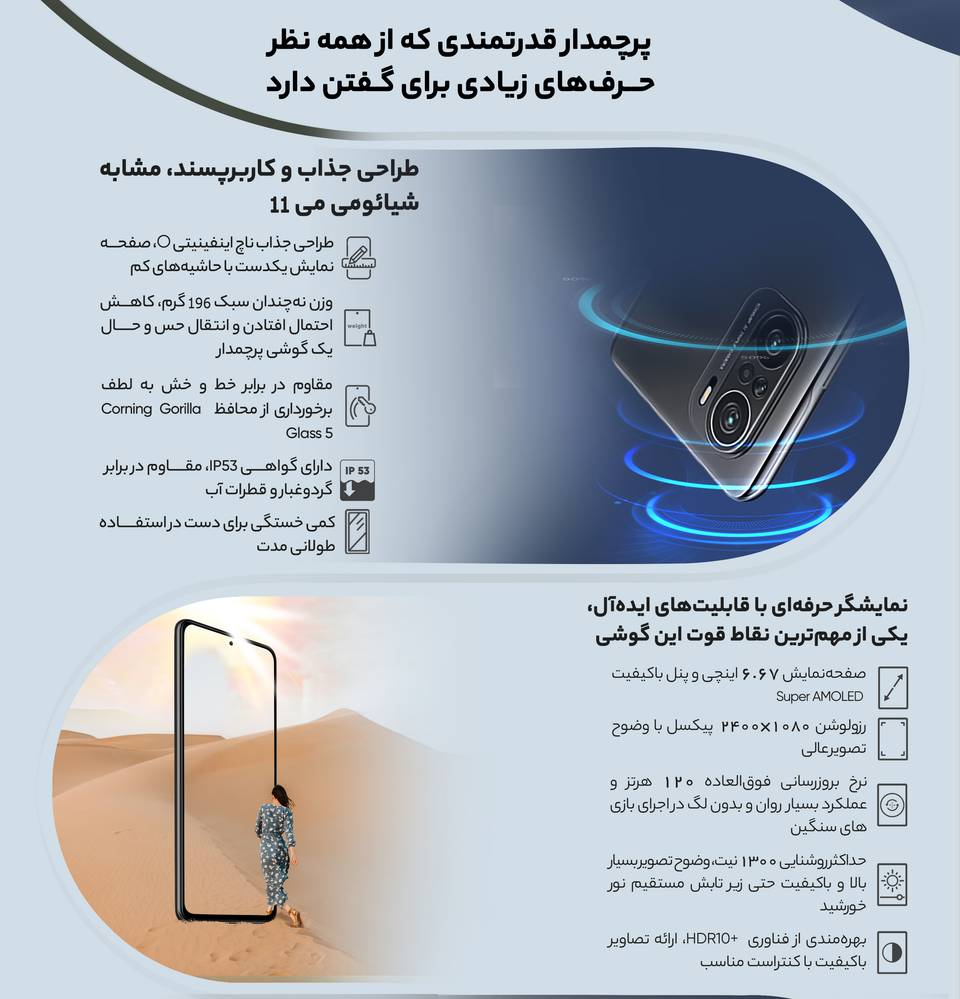 نه تنها در بخش مشخصات فنی، بلکه در بخش طراحی در نظر گرفته شده هم این گوشی هوشمند شباهت بسیاری به شیائومی می 11 دارد. در نمای روبهرویی صفحه نمایش یکدست با حاشیههای بسیار کمی را میبینیم که به طراحی ناچ اینفینیتی O مجهز شده است. بریدگی دایرهای شکل ناچ با قطر بسیار کم در قسمت بالایی و مرکزی صفحهنمایش، سنسور دوربین سلفی را در خود جای داده است. سوای مشخصات قدرتمند این صفحهنمایش که در ادامه به آن میپردازیم، حاشیههای کم سبب شده تا نزدیک به 86 درصد از نمای روبهرویی را صفحه نمایش به خودش اختصاص دهد. در قسمت پشتی هم سه سنسور دوربین را مشاهده میکنیم که با معماری شبیه به شیائومی می 11 در کنار یکدیگر قرار گرفتهاند. متریال باکیفیت پلاستیکی وزن 196 گرمی برای این گوشی هوشمند به همراه داشته است. شاید وزن این گوشی به نسبت بسیاری از گوشیهای دیگر سنگینتر باشد، اما نه به اندازهای که در استفادههای طولانی مدت خستگی برای دست کاربر داشته باشد و از طرفی همین وزن سبب میشود تا در حین کار کردن با این گوشی، احتمال افتادن به شدت کاهش یابد و حس و حال یک گوشی هوشمند پرچمدار را به کاربر منتقل میکند. متاسفانه شیائومی می 11i توانایی پشتیبانی از استاندارد IP68 را ندارد اما پشتیبانی از استاندارد IP53 سبب شده تا این گوشی در مقابل پاشش قطرات آب (قطرات باران) مقاوم باشد.