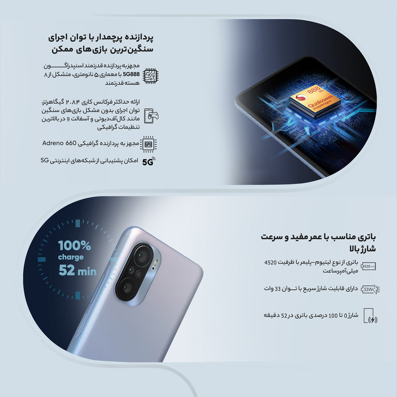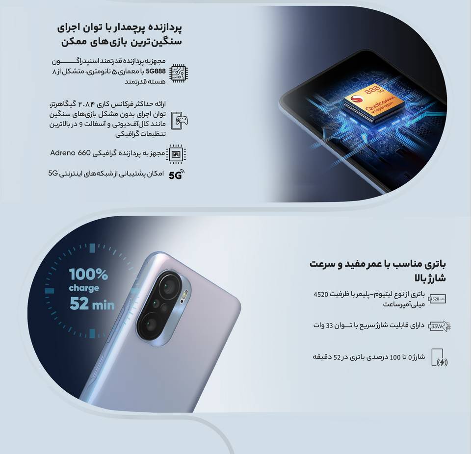 همانطور که در ابتدا اشاره کرده بودیم، شیائومی می 11 اولین گوشی هوشمند جهان بود که به پردازنده قدرتمند اسنپدراگون 888 مجهز شد. شیائومی می 11i هم از این پردازنده قدرتمند بهره برده است. پردازندهای با معماری 5 نانومتری که از 8 هسته متشکل از یک هسته قدرتمندتر با توانایی ارائه حداکثر فرکانس کاری 2.84 گیگاهرتز، سه هسته با توانایی ارائه فرکانس کاری 2.42 گیگاهرتز و 4 هسته اقتصادی با صرفه انرژی کمتر و توانایی ارئه فرکانس کاری 1.8 گیگاهرتز بهره میبرد. سوای مشخصات قدرتمند این پردازنده، باید بدانید که اسنپدراگون 888 بعد از اسنپدراگون 888 پلاس به عنوان قدرتمندترین پردازنده گوشیهای هوشمند اندرویدی شناخته میشود. پس با خیال راحت میتوانید سنگینترین بازیهای ممکن برای گوشیهای هوشمند مثل کالآفدیوتی موبایل و آسفالت 9 را در بالاترین تنظیمات گرافیکی با توجه به حضور پردازنده گرافیکی Adreno 660 اجرا کنید و در کنار صفحهنمایش بسیار قدرتمند با توانایی ارائه نرخ بروزسانی 120 هرتز، گیمپلی بسیار جذابی را تجربه کنید.