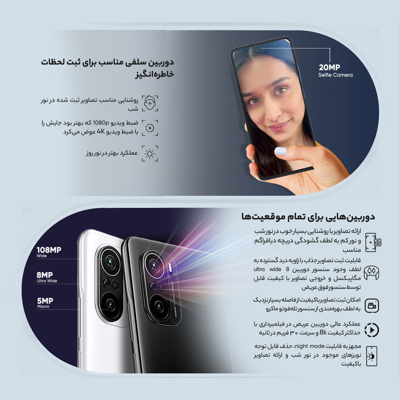 اما سنسور دوربین فوق عریض یا همان ultra wide شاید زاویه دید گستردهتری به نسبت سنسور دوربین اصلی بهره برده باشد و بتواند تصاویر جذابی برای مثال در طبیعت و عکسهای گروهی به ثبت برساند، اما شاید بهتر بود که میزان رزولوشن بیشتری برای این سنسور دوربین در نظر گرفته میشد تا جزئیات در تصاویر خروجی بهتر دیده میشد. دوربین ماکرو نیز امکان ثبت تصاویر از فاصله نزدیک را ممکن ساخته است. اما در ضبط ویدیو نیز این گوشی هوشمند حرفهای بسیاری برای گفتن دارد و توانایی ضبط ویدیو با حداکثر کیفیت 8k و سرعت 30 فریم در ثانیه را دارد. حضور قابلیت نرمافزاری لرزشگیر دیجیتال یا همان EIS نیز لرزشهای ناخواسته هنگام ضبط ویدیو را بهخوبی حذف میکند و در نهایت خروجی ویدیو جذابی را ارائه میکند (هرچند لرزشگیرهای اپتیکال یا همان OIS توانایی عملکرد بهتری به نسبت لرزشگیرهای دیجیتال دارند). برای دوربین سلفی هم شیائومی چیزی کم نگذاشته است. این گوشی به سنسور دوربین سلفی 20 مگاپیکسلی با گشودگی دریچه دیافراگم f/2.5 مجهز شده که توانایی ثبت تصاویر باکیفیتی در نور روز را دارد. در بخش ضبط ویدیو هم این سنسور دوربین سلفی توانایی ضبط ویدیو با حداکثر کیفیت 1080p و سرعت 30 فریم در ثانیه را دارد. شاید بهتر بود شیائومی برای سنسور دوربین سلفی توانایی ضبط ویدیو با حداکثر کیفیت 4K را در نظر میگرفت.