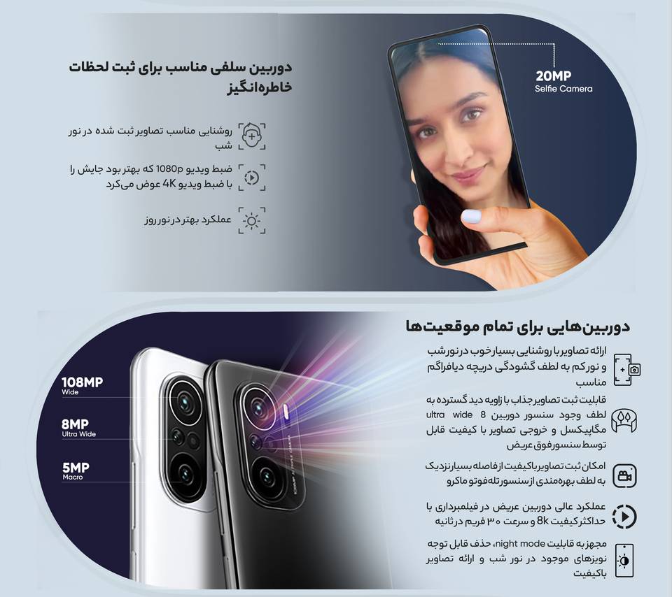 گوشی موبایل شیائومی مدل Mi 11i M2012K11G دو سیم کارت ظرفیت 256 گیگابایت یکی از شگفتانگیزترین گوشیهای کمپانی بزرگ شیائومی است که با رونمایی آن، همه افرادی که از طرفداران شیائومی هستند را شگفتزده کرده است. این گوشی تحول بسیار بزرگی در تصویربرداری، قدرت پردازش منطقی، محاسباتی، گرافیکی و وظایف اینترنتی از قبیل بازی، سوشیال و بسیاری دیگر ایجاد کرده است. در گوشی شیائومی نمایشگر تقریباً تمام قاب جلویی گوشی را پر کرده است. این بدنهی زیبا در کنار نمایشگر این محصول، با استفاده از Corning Gorilla Glass 5 محافظت میشود تا گوشی در برابر خطوخش ایمن باشد. حافظههایی که در این گوشی بهکار رفته است دارای ظرفیتهای بسیار بالایی هستند. 256 گیگابایت برای حافظهداخلی و 8 گیگابایت حافظه RAM میتواند همهکارهای همزمان سنگین شما را بهراحتی انجام دهد. این گوشی شیائومی دارای فناوری ارتباطی شبکه 5G یا نسل پنجم است که اتفاقی بسیار بزرگ و پرقدرت در بهبود سرعت دانلود و آپلود است. این گوشی میتواند با کیفیت 8K تصویربرداری کند.