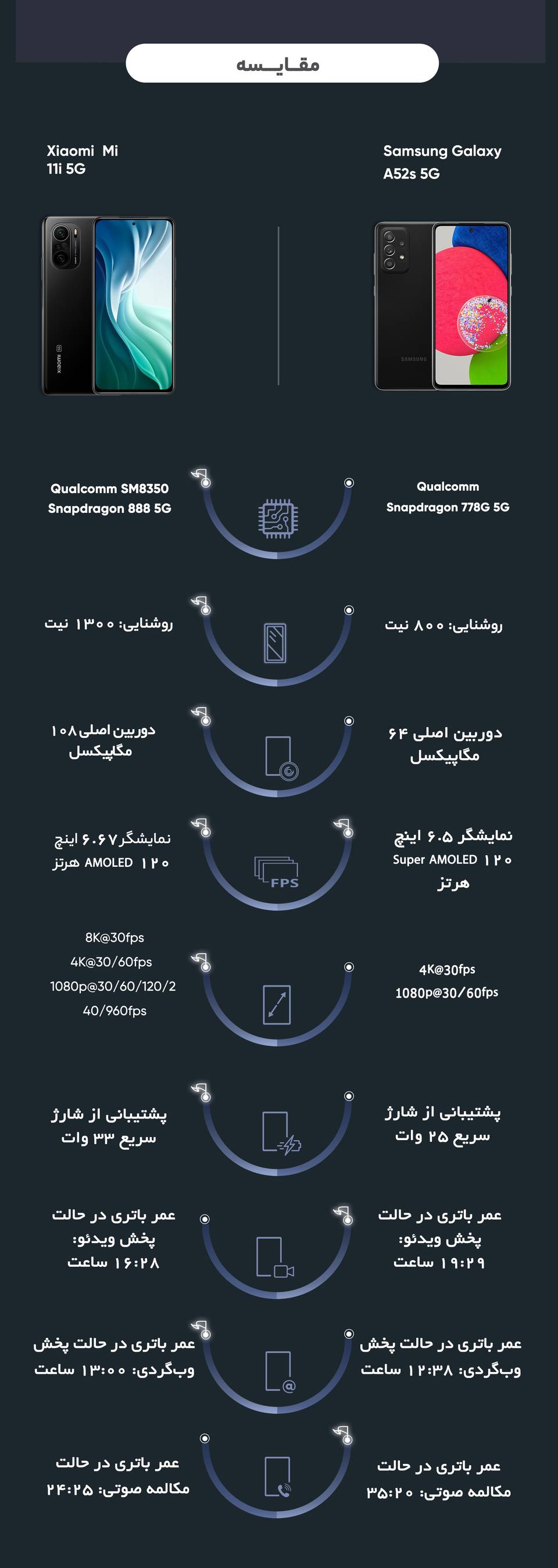 | سایر مشخصات فیلمبرداری | رزولوشن 4320 × 7680 و سرعت 30 فریم بر ثانیه (8K@30fps) رزولوشن 2160 × 3840 و سرعت 60 فریم بر ثانیه (4K@60fps) رزولوشن 2160 × 3840 و سرعت 30 فریم بر ثانیه (4K@30fps) رزولوشن 1080 × 1920 و سرعت 30 فریم بر ثانیه (1080p@30FPS) رزولوشن 1080 × 1920 و سرعت 60 فریم بر ثانیه (1080p@60FPS) رزولوشن 1080 × 1920 و سرعت 120 فریم بر ثانیه (1080p@120FPS) رزولوشن 1080 × 1920 و سرعت 240 فریم بر ثانیه (1080p@ 240FPS) رزولوشن 1080 × 1920 و سرعت 960 فریم بر ثانیه (1080p@960FPS) با تثبیت کننده الکترونیکی تصویر مبتنی بر ژیروسکوپ (gyro-EIS) HDR10+ |