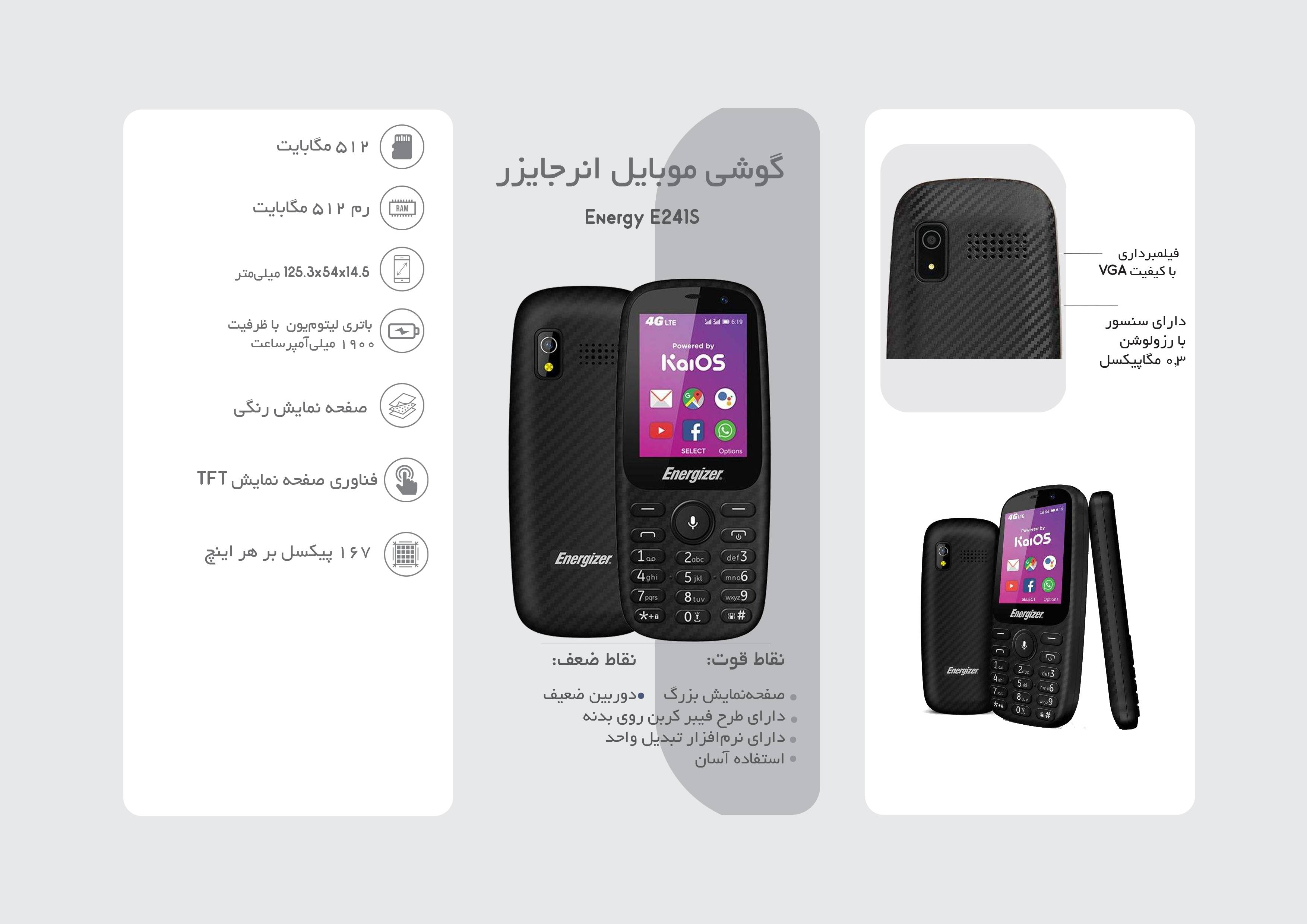 گوشی موبایل «Energy E241S» محصولی از شرکت انرجایزر (Energizer) است که با طراحی گوشیهای کلاسیک روانه بازار شده است. انرجایزر در طراحی ویژهی Energy E241S صفحهکلیدی قرار داده که تایپ و ارسال پیامک بهوسیله آن بسیار آسان خواهد بود؛ این صفهکلید امکان تایپ فارسی را هم فراهم میکند. همچنین این محصول از دو سیمکارت پشتیبانی میکند. گوشی Energy E241S به نمایشگری 2.4 اینچی مجهز شده که از نوع LCD است و در ساخت آن از فناوری TFT بهره گرفته شده است. از دیگر ویژگیهای این محصول انرجایزر میتوانیم به بلوتوث نسخهی 2.1 و رادیو FM اشاره کنیم. برخلاف بسیاری از محصولات کلاسیک، در Energy E241S دوربین سلفی وجود دارد و روی قاب پشتی آن سنسوری از نوع VGA نقش دوربین اصلی را ایفا میکند. علاوه بر این گوشی موبایل Energy E241S از فناوری بلوتوث، Wi-Fi و شبکه های نسل چهارم پشتیبانی می کند. گفتنی است که تمام این سختافزار توسط یک باتری پرقدرت لیتیوم یونی با ظرفیت 1900 میلیآمپرساعت تغذیه میشود.
