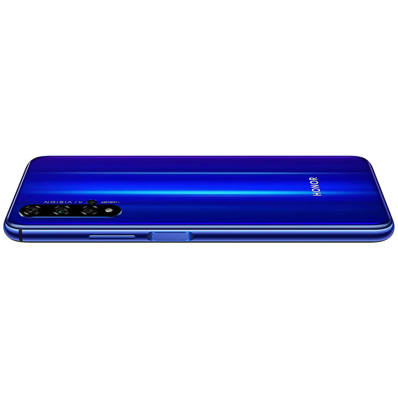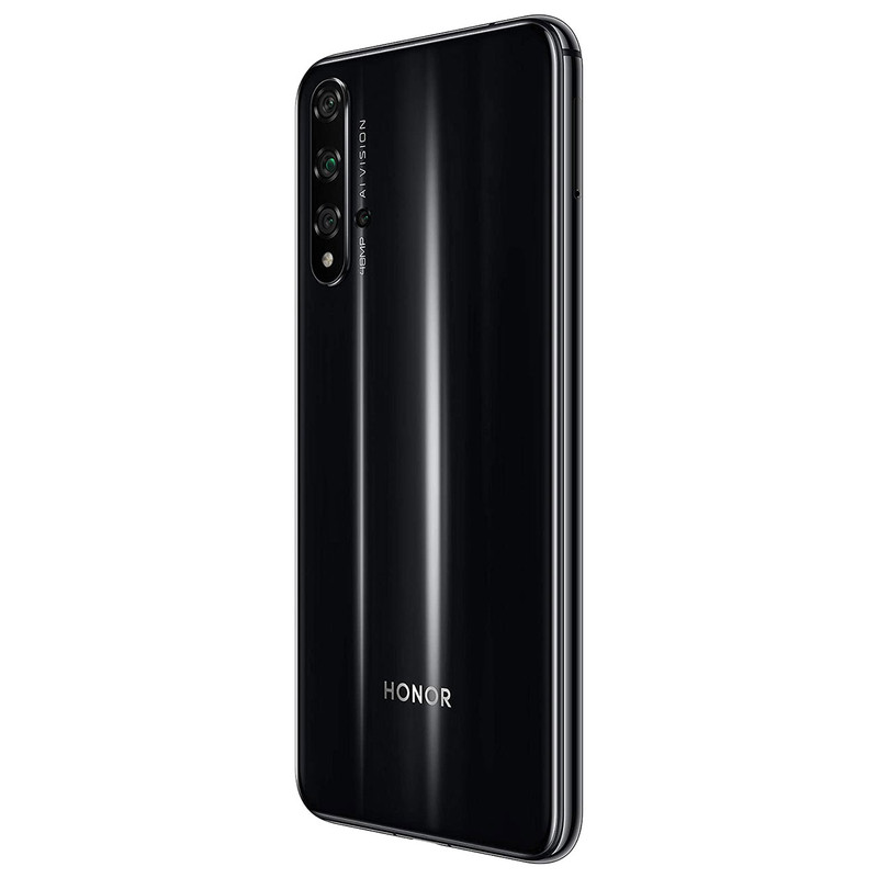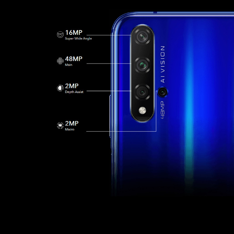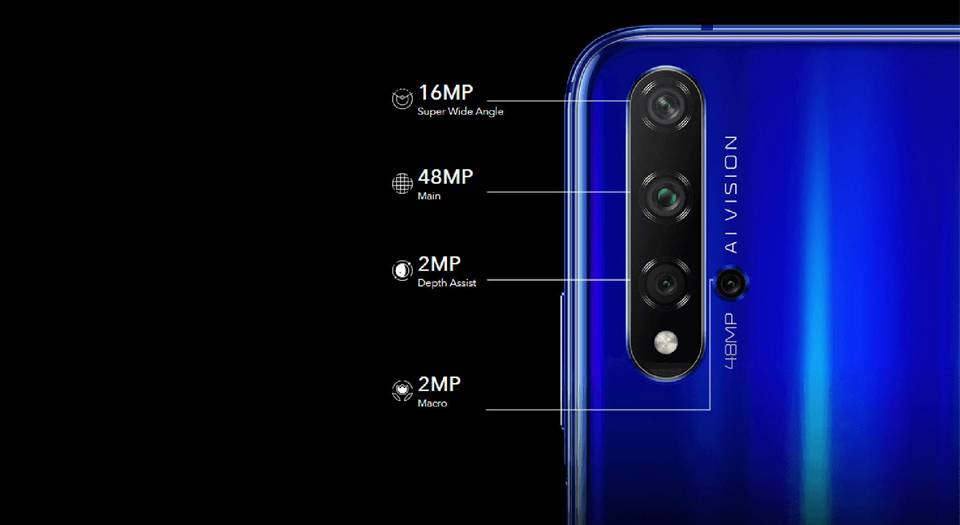 حسگر اثر انگشت در گوشی Honor 20 بر روی لبه کناری منتقل شده است. این حسگر از ظرافت بالایی برخوردار است و با وجود قابلیت Always-On ، سرعت عمل بالایی دارد. با انتقال حسگر اثر انگشت، بر روی قاب پشتی فقط دوربین چهارگانه قرار گرفته است. لنزهای دوربین در گوشه بالا و سمت چپ به عمودی و زیر هم قرار گرفته اند. سه لنز دوربین به همراه فلش در یک باکس مشکی رنگ قرار گرفته اند که با کمی برآمدگی همراه شده است. یک لنز دوربین هم خارج از باکس تعبیه شده است. لنز ها به ترتیب از بالا به پایین شامل یک لنز 16 مگاپیکسلی فوق عریض، لنز اصلی 48 مگاپیکسلی و سنسور عمق 2 مگاپیکسلی است. مانند ست آپ دوربین Honor 20 Pro خارج از باکس دوربین Honor 20 هم لنز ماکرو 2 مگاپیکسلی قرار گرفته است. تعدادی از ویژگی ها هم در لیست Honor 20 دیده نمی شود که در میان آن ها می توان به درگاه 3.5 میلی متری هدفون، درگاه برای نصب کارت حافظه و همچنین استانداردهای ضد آب اشاره کرد. البته با نگاهی به قیمت این گوشی می توان از آن ها چشم پوشی کرد.