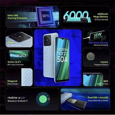 تا به امروز شاهد رونمایی گوشیهای هوشمند میانرده بسیار خوب و باکیفیتی از برند ریلمی بودیم. گوشیهای هوشمندی که در کنار بهره بردن از مشخصات فنی مناسب، قیمت مقرون بهصرفهای هم داشتهاند. یکی از این گوشیهای هوشمند میانرده Narzo 50A RMX3430 است که میتوان گفت در جایگاه یک گوشی هوشمند میانرده به مشخصات فنی مناسب و قابل قبولی مجهز شده است. در نمای روبهرویی این گوشی به صفحهنمایش با ابعاد 6.5 اینچ و رزولوشن 720×1600 پیکسل از نوع IPS مجهز شده است. صفحهنمایشی که توانایی نمایش 270 پیکسل در هر اینچ را دارد. برای طراحی صفحهنمایش هم از ناچ واتردراپ یا همان قطرهای استفاده شده است. بریدگی قطرهای شکل ناچ در قسمت بالایی و مرکزی صفحهنمایش، سنسور دوربین سلفی با رزولوشن 8 مگاپیکسل را در خود جای داده است. در قسمت پشتی هم یک سنسور دوربین اصلی قدرتمند با رزولوشن 50 مگاپیکسل و گشودگی دریچه دیافراگم f/1.8 از نوع عریض در کنار دو سنسور با رزولوشن 2 مگاپیکسل از نوع سنجش عمق و ماکرو، سنسورهای دروبین سهگانه این گوشی هوشمند میانرده را تشکیل میدهند. در بخش مشخصات سختافزاری هم، Narzo 50A RMX3430 به پردازنده میانرده هلیو G85 شرکت مدیاتک مجهز شده است. باتری قدرتمند با میزان ظرفیت 6000 میلیآمپرساعت هم توانایی ارائه طول عمر مفید بیش از دو روز را به ازای هر بار شارژ 100 در استفاده معمولی خواهد داشت.