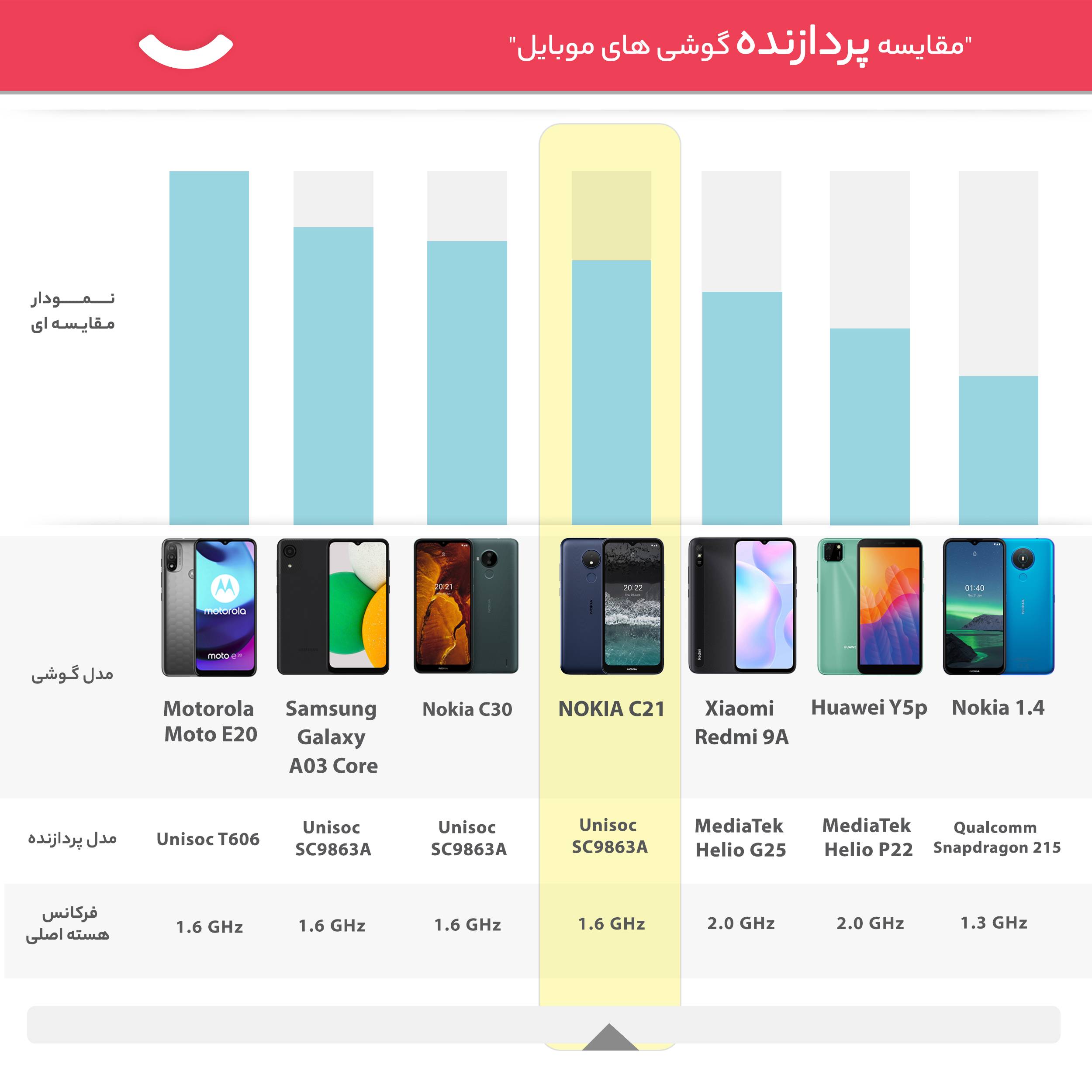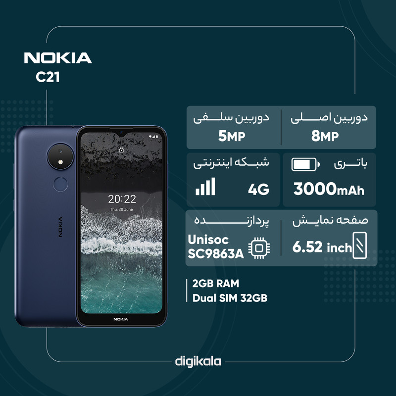در بین گوشیهای هوشمند شرکت نوکیا، شاهد رونمایی گوشیهای هوشمند میانردهای بودیم که در کنار بهره بردن از مشخصات فنی مناسب و قابل قبول، قیمت مقرون بهصرفه و ارزانتری به نسبت بسیاری از گوشیهای هوشمند موجود در بازار داشتند. یکی از این گوشیهای میانرده، گوشی موبایل نوکیا مدل C21 TA-1352 دو سیم کارت ظرفیت 32 گیگابایت و رم 2 گیگابایت است که مشخصات در نظر گرفته شده برای این گوشی سبب شده تا عملکرد قابل قبولی را از آن شاهد باشید. در نمای روبهرویی نوکیا C21 TA-1352 به صفحهنمایش با ابعاد 6.52 اینچ و رزولوشن 720×1600 پیکسل مجهز شده است. صفحهنمایشی از نوع IPSکه توانایی نمایش 269 پیکسل در هر اینچ را دارد. نوکیا C21 TA-1352 در جایگاه یک گوشی میانرده، به صفحهنمایش قابل قبولی مجهز شده است. در قسمت پشتی هم تنها یک سنسور دوربین با رزولوشن 8 مگاپیکسل را شاهد هستیم که توانایی ثبت تصاویر مناسبی را در نور روز دارد و دوربین سلفی با رزولوشن 5 مگاپیکسل این گوشی هم با توجه به تستهای انجام شده، در تماسهای تصویری، کیفیت مناسبی را ارائه میکند. در بخش مشخصات سختافزاری اما این گوشی به پردازنده Unisoc SC9863A که برای استفاده روزمره و اجرای نرمافزارهای محبوب، عملکرد خوبی دارد اما نباید چندان برای اجرای بازیهای سنگین روی آن حساب باز کرد. سیستم عامل پایه Android 11 برای این گوشی در نظر گرفته شده است. باتری با میزان ظرفیت 3000 میلیآمپرساعت هم از دیگر مشخصات در نظر گرفته شده برای این گوشی است.