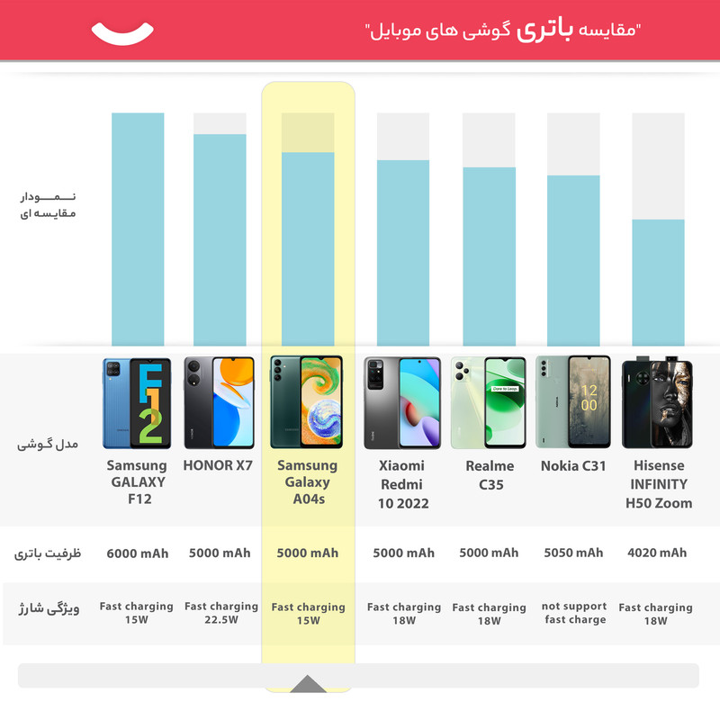 برای اجرای بازیهای محبوب و نرمافزارهای پرکاربرد باید بدانید که میتوانید روی این گوشی حساب باز کنید. برای بازیهای سنگین مثل کالآفدیوتی موبایل، آسفالت ۹ و PUBG موبایل هم پیشنهاد میکنیم که تنظیمات گرافیکی بازی را روی حالت Low قرار دهید تا عملکرد روان و بدون لگ را از سامسونگ Galaxy A04s شاهد باشید. در بخش باتری هم حضور باتری با میزان ظرفیت ۵۰۰۰ میلیآمپر ساعت هم انتخاب بسیار خوبی برای این گوشی بود که، به ازای هر بار شارژ صد درصدی در استفاده معمولی، توانایی ارائه طول عمر مفید (زمان آماده بهکار) دو روز را دارد که عملکرد بسیار خوب و کاملا قابل قبولی است. حتی در شرایط استفاده سنگین (روشن بودن دیتای موبایل، اجرای بازی و تماشای ویدیو) هم با هر بار شارژ کردن، در طول یک روز میتوانید از این گوشی استفاده کنید و نگرانی بابت تمام شدن شارژ باتری نداشته باشید.