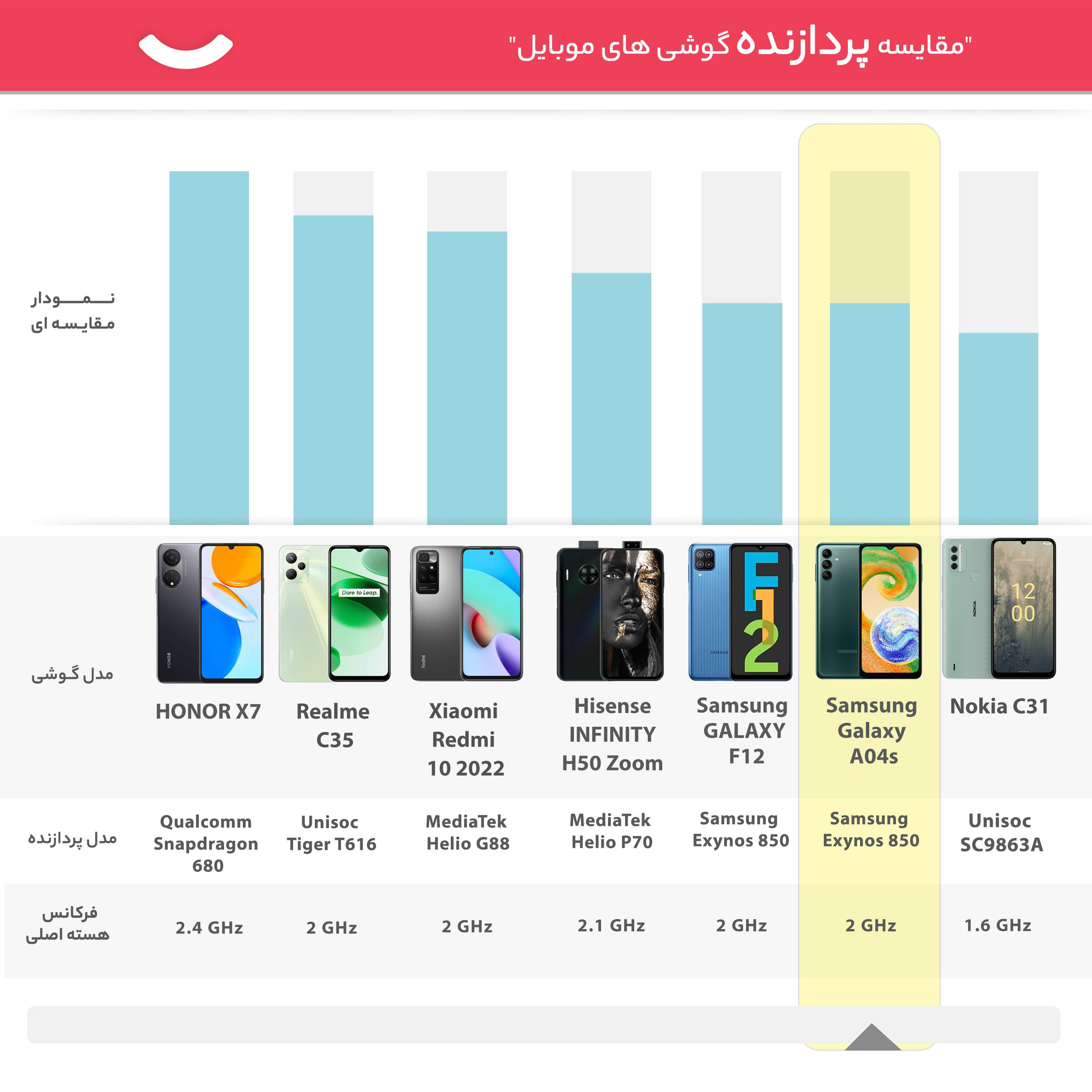 از یک گوشی میانرده در این بازه قیمتی توقع داریم که در اجرای فعالیتهای روزمره و نرمافزارهای کاربردی، عملکرد خوبی داشته باشد و باید بگوییم که سامسونگ Galaxy A04s از این نظر توقع شما را برآورده میکند. پردازنده اگزینوس ۸۵۰ اختصاص سامسونگ با معماری ۸ نانومتری این گوشی را همراهی میکند. پردازندهای که در بهترین حالت ممکن، توانایی ارائه فرکانس کاری ۲.۰ گیگاهرتز را دارد. از مزیتهای این پردازنده میتوانیم به معماری ۸ نانومتری آن اشاره کنیم که به نسبت پردازندههایی با معماری ۹ و ۱۰ نانومتری، صرفه انرژی کمتری دارد و در نهایت تاثیر مستقیم در طول عمر مفید (زمان آماده بهکار) باتری به ازای هر بار شارژ صد درصدی دارد.