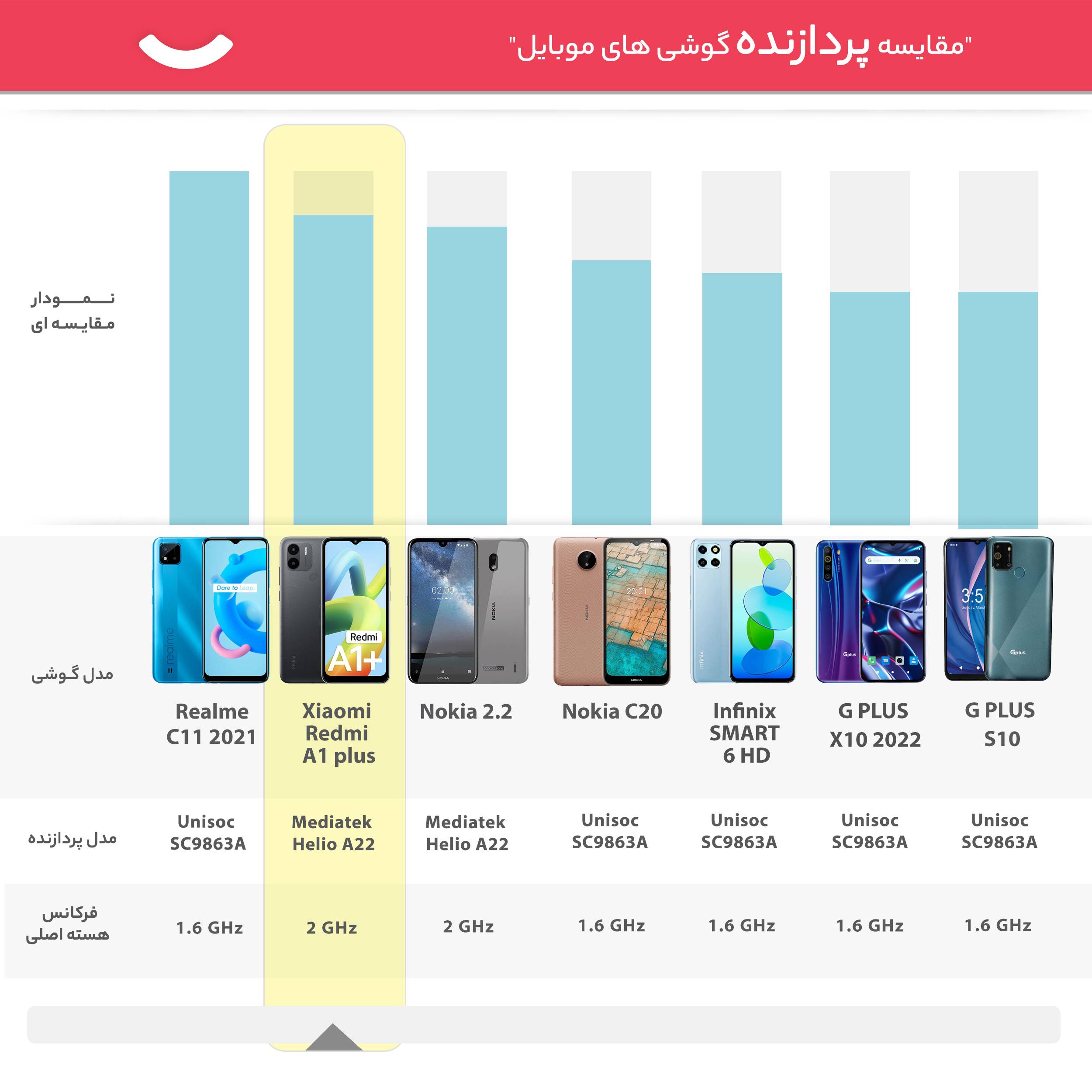 در بخش مشخصات سختافزاری، شیائومی Redmi A1 Plus به پردازنده میانرده هلیو A22 شرکت مدیاتک مجهز شده است. هستههای در نظر گرفته شده برای این پردازنده در بهترین حالت ممکن، توانایی ارائه فرکانس کاری ۲.۰ گیگاهرتز را دارند. با این تفاسیر خیالتان راحت باشد که شیائومی Redmi A1 Plus، توانایی ارائه عملکرد بسیار قابل قبولی در اجرای بازیهای نه چندان سنگین و برنامههای کاربردی دارد. در مجموع باید بگوییم که این گوشی برای استفاده روزمره، گزینه بسیار مناسبی است و تمام توقعات شما را در اجرای برنامههای کاربردی برآورده میکند. در انتها هم باتری ۵۰۰۰ میلیآمپرساعت این گوشی هم انتخاب بسیار خوبی بود. باتری که به ازای هر بار شارژ صد درصدی، توانایی ارائه طول عمر مفید (زمان آماده بهکار) بیشتر از یک روز و کمتر از دو روز را ارائه میکند. در مجموع باید بگوییم که اگر به دنبال خرید گوشی هوشمند ارزان قیمتی هستید که در درجه اول از طراحی بسیار کاربر پسندی بهره برده باشد و صفحهنمایش مناسب با وضوح تصویر خوب در شرایط نوری متنوع، دوربین اصلی مناسب برای ثبت تصاویر معمولی در نور روز، دوربین سلفی با عملکرد بسیار قابل قبول در تماسهای تصویر، پردازنده کاملا قابل قبول در اجرای برنامههای کاربردی و فعالیتهای روزانه و باتری با طول عمر نزدیک به دو روز از جمله مشخصات اصلی آن باشد، قطعا شیائومی Redmi A1 Plus میتواند یکی از بهترین انتخابهای ممکن برای شما باشد.