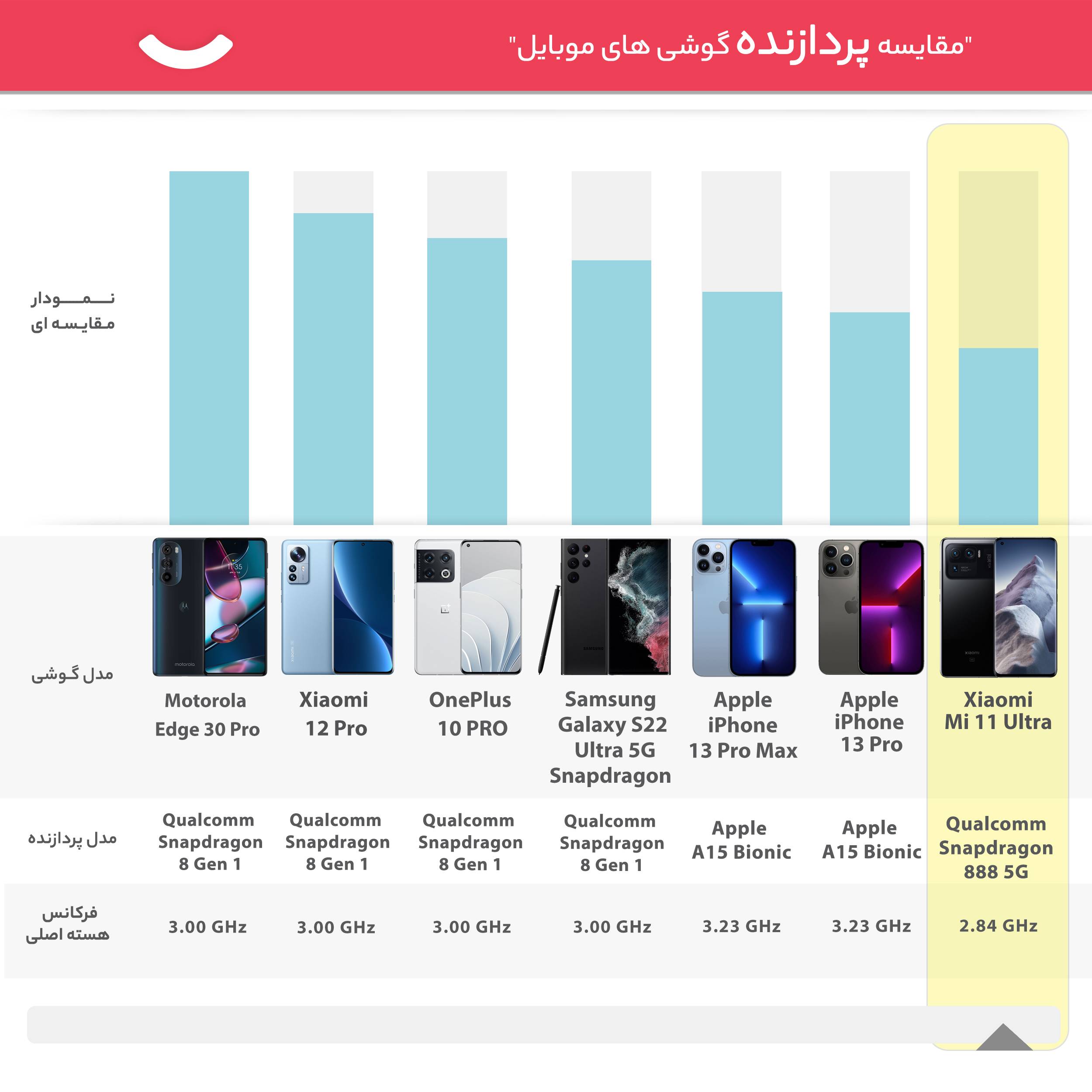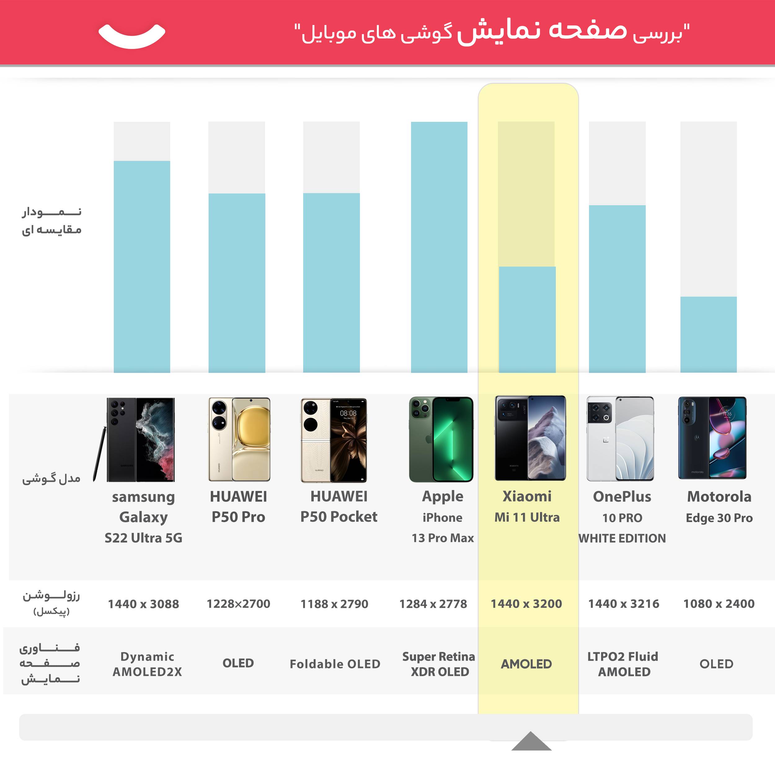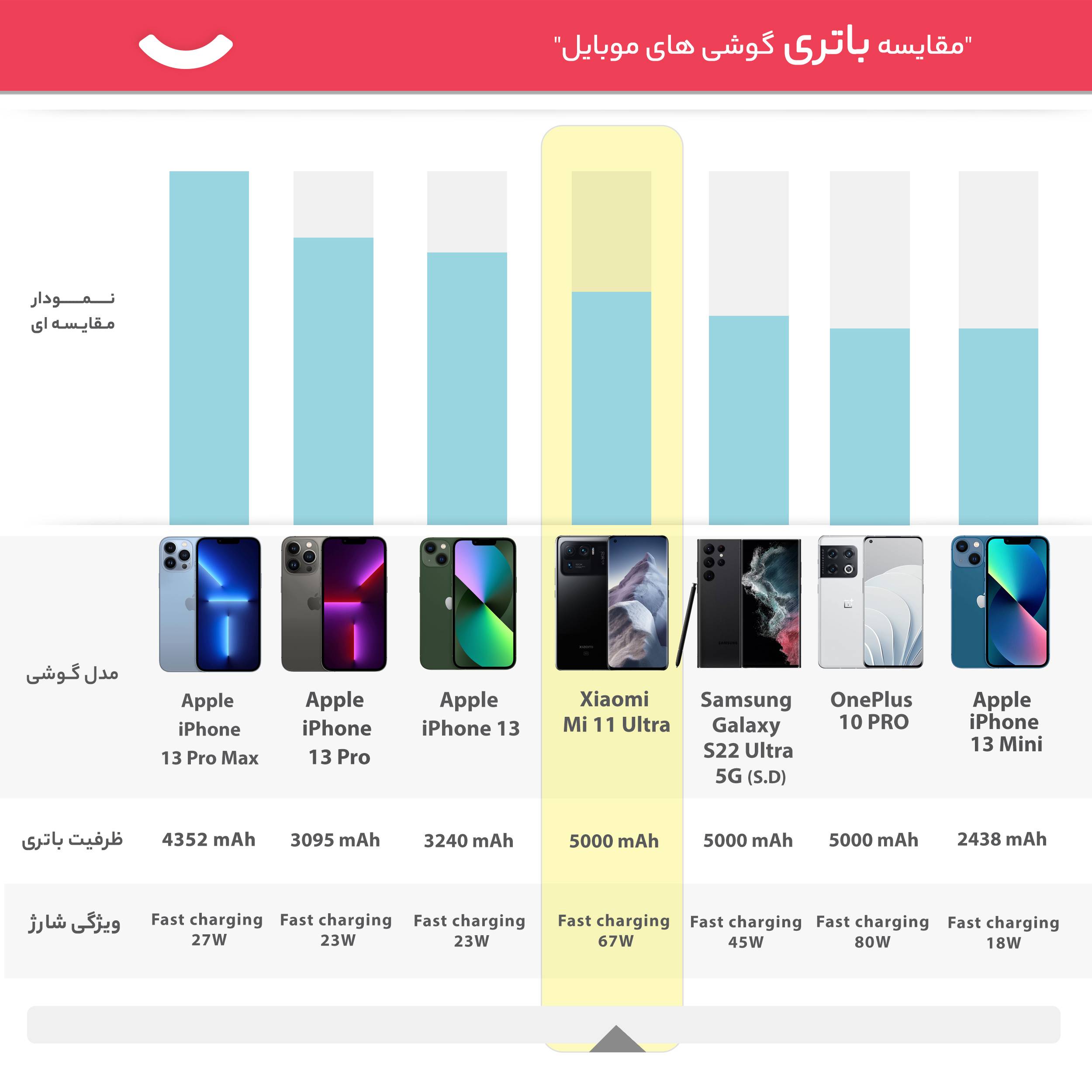 شیائومی Mi 11 Ultra یکی از قدرتمندترین گوشیهای هوشمند این شرکت است که در جایگاه یک گوشی پرچمدار، توانایی ارائه عملکرد بسیار خوبی را دارد. این گوشی به صفحهنمایش با ابعاد 6.81 اینچ و رزولوشن 1440×3200 پیکسل از نوع AMOLED مجهز شده است. صفحهنمایش بسیار باکیفیت که توانایی نمایش 515 پیکسل در هر اینچ و نرخ بروزرسانی 120 هرتز را دارد. روشنایی 1700 نیت (شمع در متر مربع) هم از دیگر قابلیتهای جذاب این صفحهنمایش است. در قسمت پشتی این گوشی شاهد قرار گیری سه سنسور دوربین هستیم که توانایی ارائه عملکرد فوق العادهای را دارند. یک سنسور دوربین اصلی با رزولوشن 50 مگاپیکسل از نوع عریض در کنار سنسور 48 مگاپیکسل از نوع پریسکوپ تلهفوتو و سنسور 48 مگاپیکسل از نوع فوق عریض (ultrawide) با زاویه دید 128 درجه، سنسورهای دروبین سهگانه شیائومی Mi 11 Ultra را تشکیل میدهند. برای دوربین سلفی هم سنسور با رزولوشن 20 مگاپیکسل در نظر گرفته شده است. حضور پردازنده قدرتمند اسنپدراگون 888 5G شرکت کوالکام سبب شده تا شیائومی Mi 11 Ultra بهراحتی از پس سنگینترین بازیهای ممکن روز دنیا بربیاید و از طرفی امکان پشتیبانی از شبکههای اینترنتی نسل پنجم یا همان 5G را هم داشته باشد. باتری با میزان ظرفیت 5000 میلیآمپرساعت هم از دیگر مشخصات در نظر گرفته شده است. پشتیبانی از فناوری شارژ سریع 67 واتی سبب شده هم تا شارژ صفر تا صد درصدی باتری در مدت زمان بسیار کوتاه 36 دقیقه انجام شود.