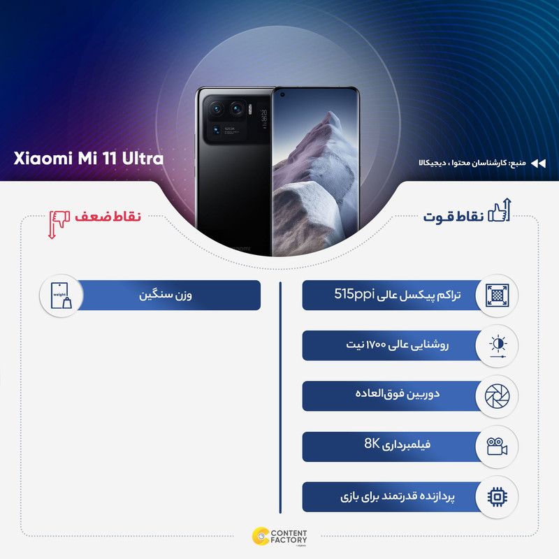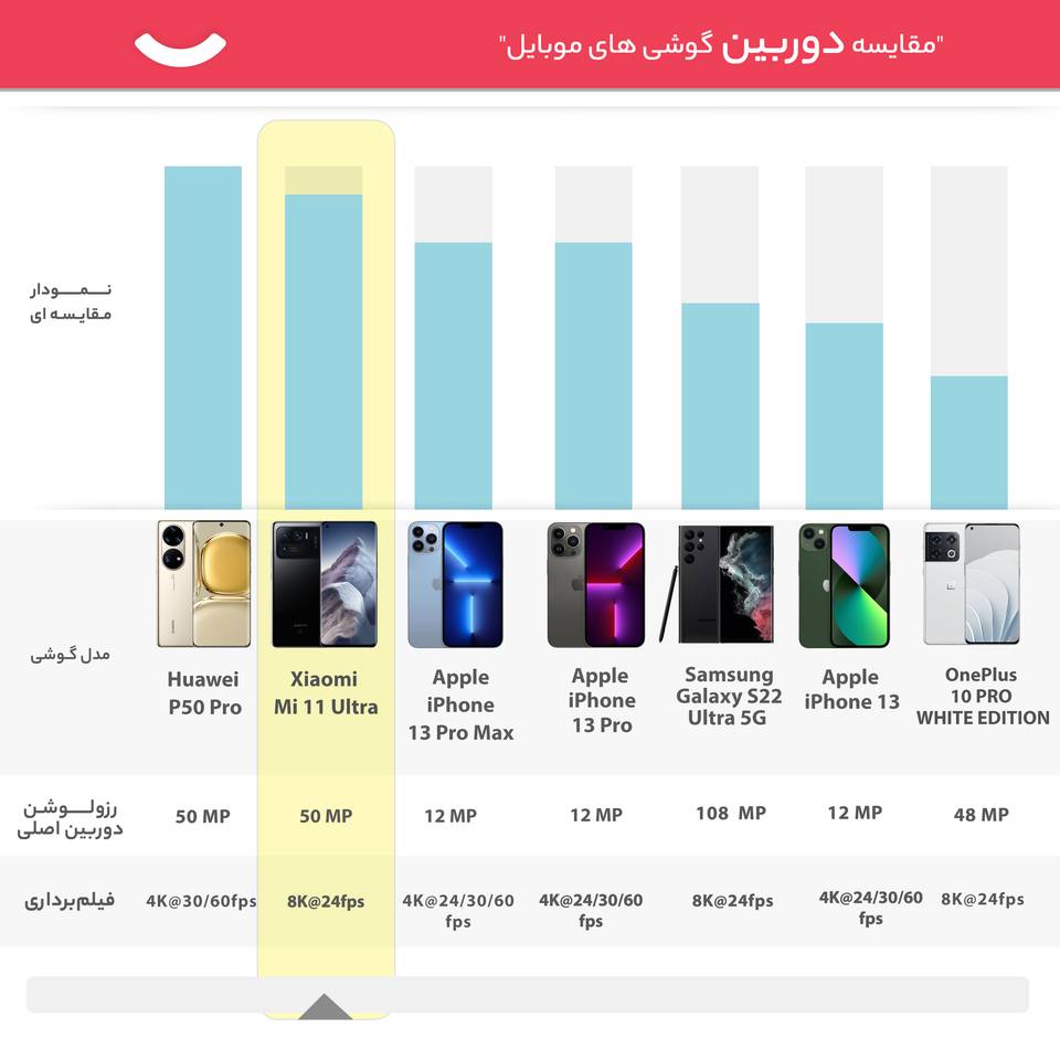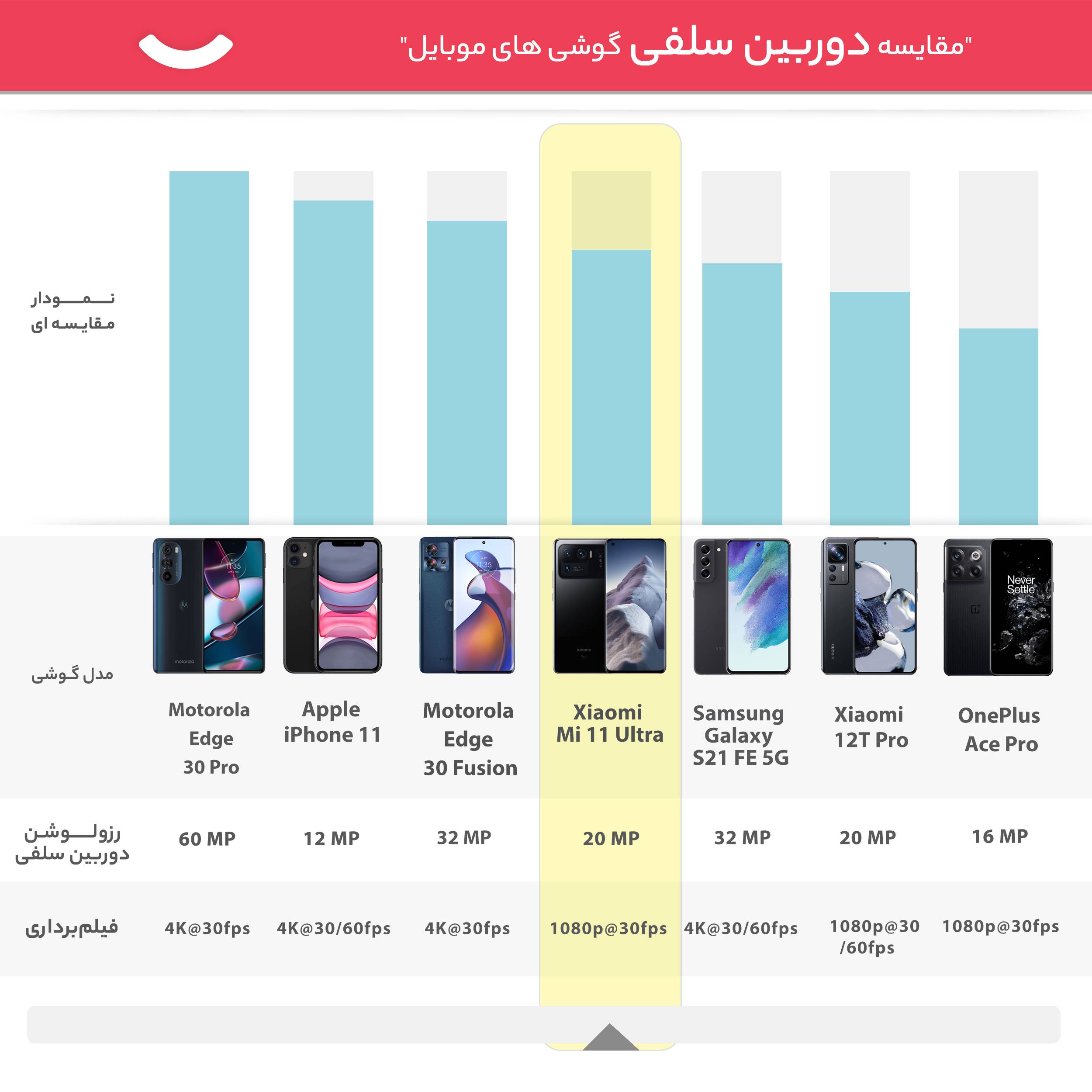 شیائومی Mi 11 Ultra یکی از قدرتمندترین گوشیهای هوشمند این شرکت است که در جایگاه یک گوشی پرچمدار، توانایی ارائه عملکرد بسیار خوبی را دارد. این گوشی به صفحهنمایش با ابعاد 6.81 اینچ و رزولوشن 1440×3200 پیکسل از نوع AMOLED مجهز شده است. صفحهنمایش بسیار باکیفیت که توانایی نمایش 515 پیکسل در هر اینچ و نرخ بروزرسانی 120 هرتز را دارد. روشنایی 1700 نیت (شمع در متر مربع) هم از دیگر قابلیتهای جذاب این صفحهنمایش است. در قسمت پشتی این گوشی شاهد قرار گیری سه سنسور دوربین هستیم که توانایی ارائه عملکرد فوق العادهای را دارند. یک سنسور دوربین اصلی با رزولوشن 50 مگاپیکسل از نوع عریض در کنار سنسور 48 مگاپیکسل از نوع پریسکوپ تلهفوتو و سنسور 48 مگاپیکسل از نوع فوق عریض (ultrawide) با زاویه دید 128 درجه، سنسورهای دروبین سهگانه شیائومی Mi 11 Ultra را تشکیل میدهند. برای دوربین سلفی هم سنسور با رزولوشن 20 مگاپیکسل در نظر گرفته شده است. حضور پردازنده قدرتمند اسنپدراگون 888 5G شرکت کوالکام سبب شده تا شیائومی Mi 11 Ultra بهراحتی از پس سنگینترین بازیهای ممکن روز دنیا بربیاید و از طرفی امکان پشتیبانی از شبکههای اینترنتی نسل پنجم یا همان 5G را هم داشته باشد. باتری با میزان ظرفیت 5000 میلیآمپرساعت هم از دیگر مشخصات در نظر گرفته شده است. پشتیبانی از فناوری شارژ سریع 67 واتی سبب شده هم تا شارژ صفر تا صد درصدی باتری در مدت زمان بسیار کوتاه 36 دقیقه انجام شود.