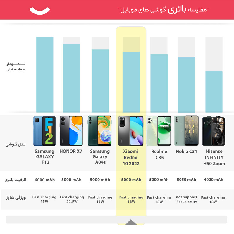 سری Redmi گوشی‌های هوشمند شیائومی تا به امروز توانسته‌اند با بهره بردن از مشخصات فنی مناسب، عملکرد بسیار قابل قبولی را به‌نمایش بگذارند.یکی از گوشی‌های هوشمند قدرتمند این سری، Redmi 10 2022 است که به مشخصات فنی قدرتمندی مجهز شده است و باید بگوییم که به نسبت مدل قبلی خود، تفاوت چشم‌گیری ندارد. این گوشی از صفحه‌نمایش با ابعاد 6.5 اینچ با رزولوشن 1080×2340 از نوع LCD مجهز شده است. تراکم پیکسل 405 پیکسل در هر اینچ و همچنین توانایی ارائه نرخ بروزرسانی 90 هرتز، نشان از کیفیت بالای این صفحه‌نمایش می‌دهد. در قسمت پشتی چهار سنسور دوربین را شاهد هستیم که یک سنسور دوربین اصلی با رزولوشن 50 مگاپیکسل از نوع عریض، سنسور 8 مگاپیکسل از نوع فوق عریض (ultra wide) و دو سنسور با رزولوشن 2 مگاپیکسل از نوع ماکرو و سنجش عمق، سنسور‌های دوربین چهار‌گانه این گوشی هوشمند را تشکیل می‌دهند. برای دوربین سلفی هم سنسور با رزولوشن 8 مگاپیکسل در نظر گرفته شده است. در بخش مشخصات سخت‌افزاری هم Redmi 10 2022 به پردازنده میان‌رده هلیو G88 شرکت مدیاتک (MediaTek Helio G88) مجهز شده است. باتری قدرتمند با میزان ظرفیت 5000 میلی‌آمپر‌ساعت هم نوید طول عمر مفید بسیار خوبی را برای این گوشی هوشمند میان‌رده می‌دهد. به ازای هر بار شارژ 100 درصدی طول عمر مفید (زمان آماده به‌کار) دو روز را در شرایط استفاده معمولی ارائه کند.
