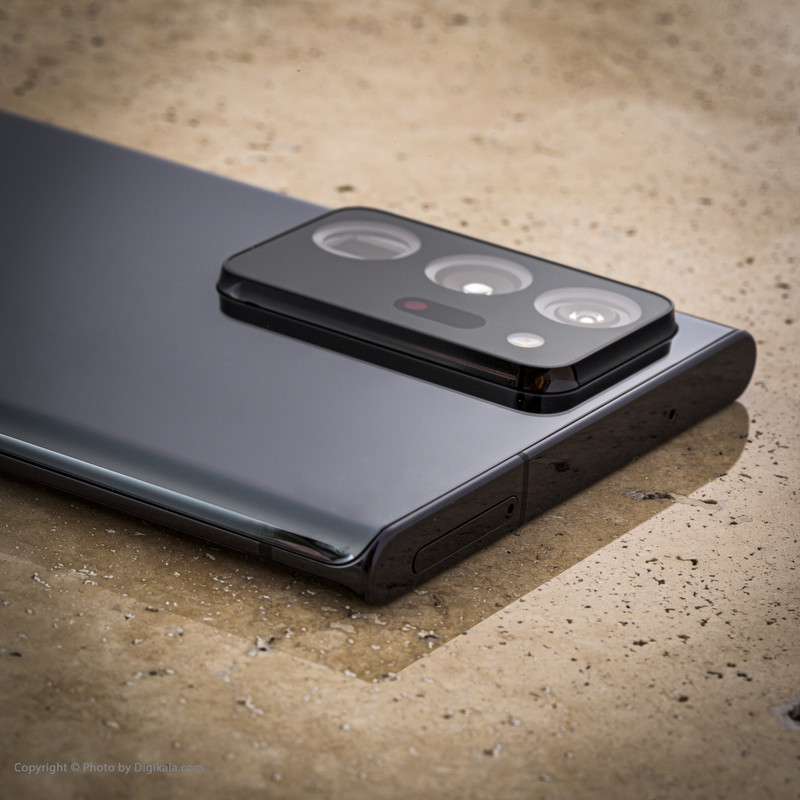 گوشیهای سری نوت سامسونگ، طراحی خاص خود را دارند که آنها را از گوشیهای سری S جدا میکند. همانطور که انتظار میرفت گوشی Note 20 Ultra هم از قاعده طراحی گوشیهای سری نوت پیروی کرده است؛ برای این گوشی لبههای تیز در نظر گرفتهشده است. این در حالی است که لبههای گوشی گلکسی S20 Ultra کاملا گرد طراحی شده است. با قرار دادن گوشی Note 20 Ultra در کنار گوشی Note 10 Plus متوجه بهبودهای آن در طراحی خواهید شد؛ حاشیه صفحهنمایش تا لبه پایین گوشی کمتر شده و حفره سلفی هم کمی کوچکتر شده است. لبههای صفحهنمایش S20 Ultra همچنان با کمی انحنا همراه شده است. برای قاب جلویی پوشش گوریلاگلس Victus در نظر گرفته شده است که در واقع نسخه جدیدتری نسبت به گوریلاگلس 6 است. گوشی Note 20 Ultra، تنها یک نوت نیست بلکه اولترا هم هست؛ تقریباً غیرممکن است که به قاب پشتی یک نگاه سریع و گذرا داشته باشید و متوجه برآمدگی دوربین سهگانه آن نشوید. ست-آپ دوربین سهگانه Note 20 Ultra بهقدری بزرگ است که نمونه مشابه آن را قبلاً در هیچ گوشی دیگری ندیدهایم. با در نظر داشتن اینکه گوشی Note 20 Ultra ضخامت کمتری نسبت به گوشی S20 Ultra دارد، برآمدگی دوربین در آن حدود 0.4 میلیمتر بیشتر است.
