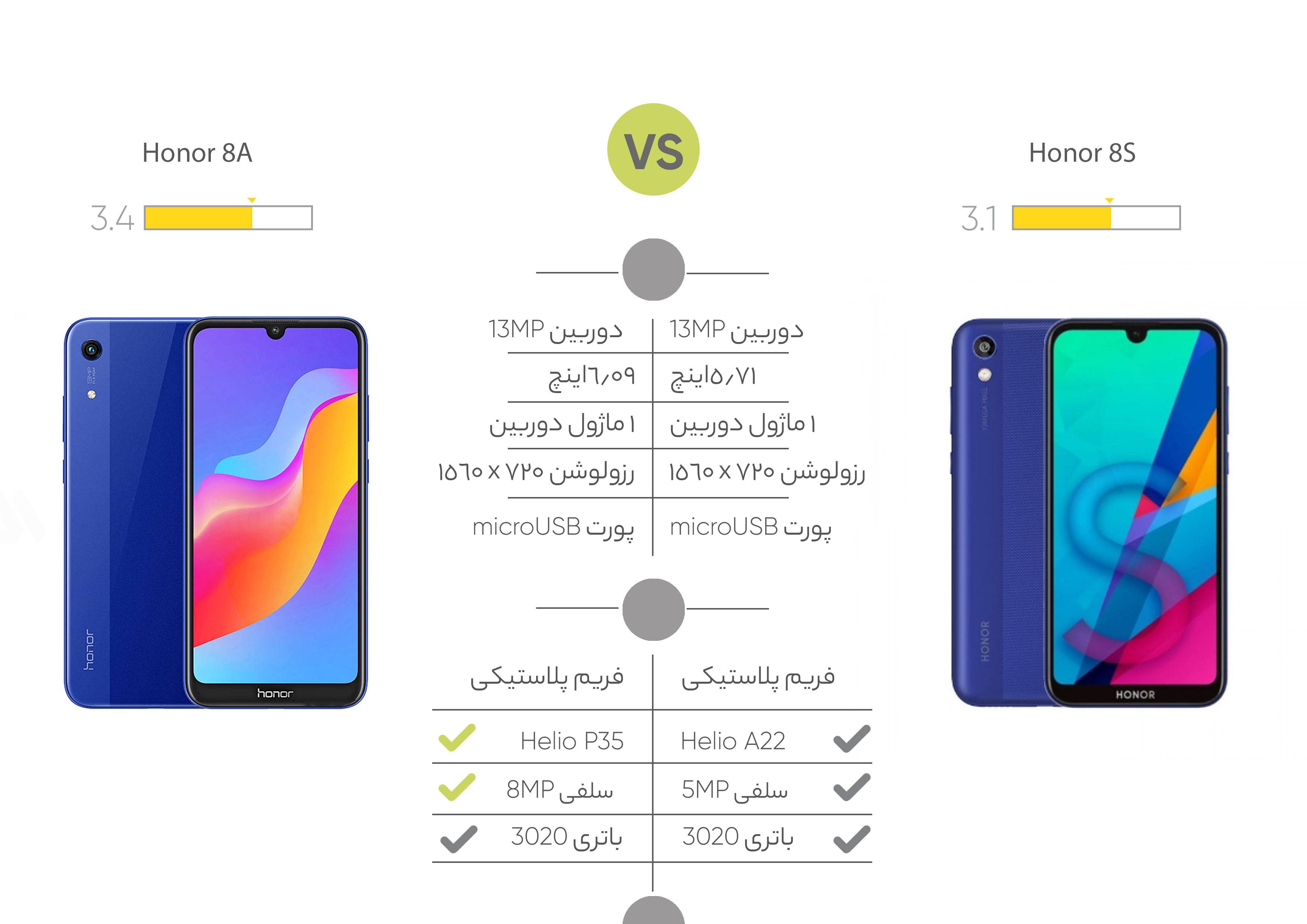 گوشی موبایل Honor 8S دارای صفحه نمایش 5.71 اینچی است. این گوشی هوشمند از پنل صفحه نمایش ال سی دی بهره می برد و دارای نسبت تصویر 19 به 9 است. در بخش پردازنده این دستگاه از چیپست 12 نانومتری MT6761 Helio A22 بهره می برد، این پردازنده 4 هسته ای با فرکانس 2 در کنار سیستم عامل اندروید 9 می تواند بسیاری از کارهای روزانه یک کاربر عادی را برطرف کند. گوشی موبایل یاد شده دارای 32 گیگابایت حافظه داخلی با رم نرم افزاری 2 گیگابایتی است. در قسمت دوربین honor 8s از یک لنز 13.0 مگاپیکسلی استفاده شده و همچنین برای دوربین سلفی آن نیز لنزی با کیفیت 5.0 مگاپیکسل در نظر گرفته شده است و همچنین این گوشی دارای باتری باظرفیت 3020 میلی آمپر ساعت می باشد.