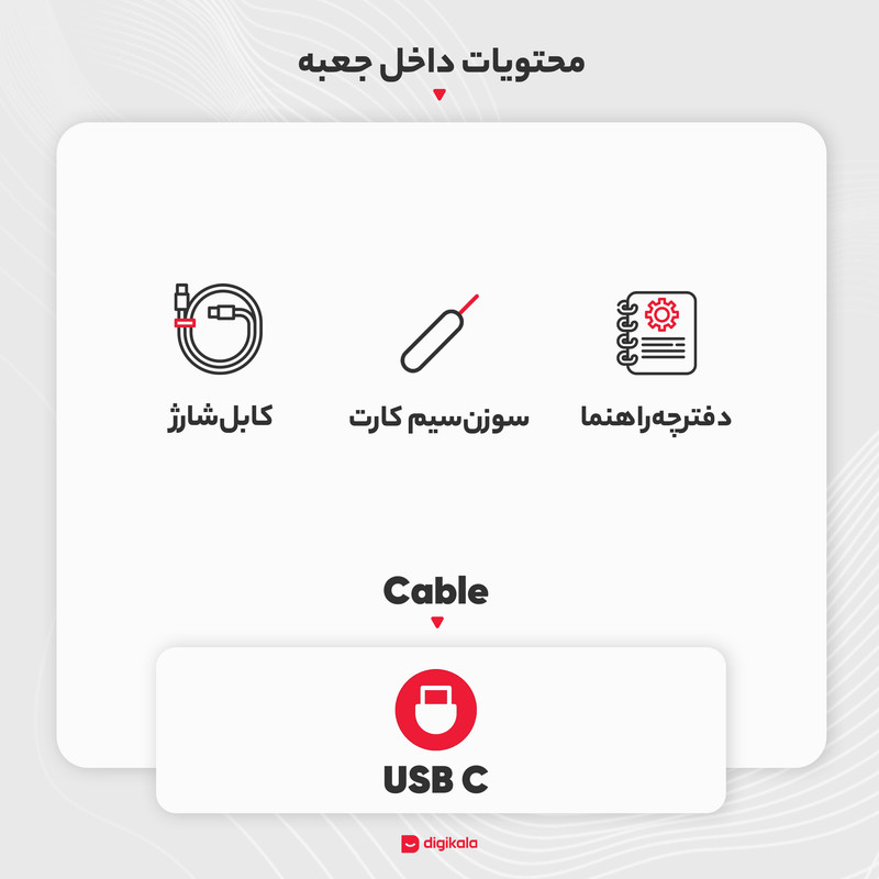 | سایر توضیحات اقلام همراه | بدون آداپتور شارژ / کابل USB-C |