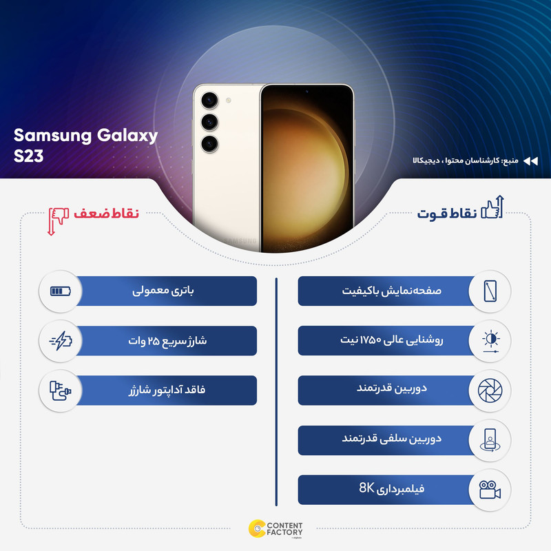 سامسونگ Galaxy S23 کوچکترین عضو خانواده گوشیهای پرچمدار S23 است که از نظر اکثر مشخصات فنی در نظر گرفته شده، تفاوت چندانی با مدل پلاس ندارد و اصلیترین تفاوت این دو گوشی در ابعاد صفحهنمایش در نظر گرفته شده است. سامسونگ Galaxy S23 این بار به نسبت نسل قبلی یعنی Galaxy S22 در زمینه طراحی قسمت پشتی متفاوت ظاهر شد و خبری از بریدگی برای قرارگیری سنسورهای دوربین نبود. این گوشی به صفحهنمایش با ابعاد 6.1 اینچ و رزولوشن 1080×2340 پیکسل از نوع Dynamic AMOLED 2X مجهز شده که توانایی نمایش 442 پیکسل، نرخ بروزرسانی 120 هرتز و حداکثر روشنایی 1750 نیت (nits) را دارد. در مجموع باید بگوییم که با یکی از قدرتمندترین صفحاتنمایش در بین گوشیهای هوشمند روبهرو هستید. در قسمت پشتی هم حضور سنسور دوربین عریض با رزولوشن 50 مگاپیکسل سبب شده تا در نور روز و نور شب عملکرد بسیار خوبی را شاهد باشید. یک سنسور 10 مگاپیکسل از نوع تلهفوتو با قابلیت زوم 3 برابری اپتیکال و سنسور 12 مگاپیکسل فوق عریض (ultrawide)، این گوشی هوشمند را همراهی میکنند. توانایی ضبط ویدیو با حداکثر کیفیت 8K و سرعت 30 فریم در ثانیه هم از دیگر مشخصات قدرتمند در نظر گرفته شده هستند. برای دوربین سلفی هم سنسور با رزولوشن 12 مگاپیکسل در نظر گرفته شده که بدون شک یکی از قدرتمندترین سنسورهای دوربین سلفی در بین گوشیهای هوشمند است که توانایی ضبط ویدیو با حداکثر کیفیت 4K و سرعت 60 فریم در ثانیه را دارد. بهره بردن از پردازنده قدرتمند اسنپدراگون 8 نسل 2 کوالکام سبب شده تا سامسونگ Galaxy S23 عملکرد بسیار خوبی در اجرای سنگینترین بازیهای روز دنیا داشته باشد. باتری با میزان ظرفیت 3900 میلیآمپرساعت و پشتیبانی از فناوری شارژ سریع با توان 25 وات هم از دیگر مشخصات در نظر گرفته شده هستند. در مجموع باید بگوییم که اگر به دنبال خرید گوشی هوشمند پرچمداری هستید و قصد دارید تا هزینه کمتری به نسبت مدل پلاس و اولترا این خانواده هزینه کنید، قطعا سامسونگ Galaxy S23 میتواند یکی از بهترین انتخابهای ممکن برای شما باشد.