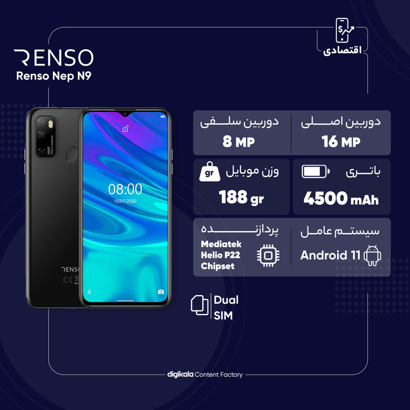 برند تازه وارد رنسو توانسته است در عرصه گوشیهای هوشمند میانرده با قیمتی مقرون بهصرفه، با معرفی محصولات باکیفیت عملکرد خوب و قابل قبولی را بهنمایش بگذارد. رنسو Nep N9 هم یکی از گوشیهای اقتصادی این شرکت است. این گوشی به صفحهنمایش با ابعاد 6.52 اینچ و رزولوشن 720×1600 پیکسل مجهز شده که عملکرد قابل قبولی را در حد و اندازه یک گوشی اقتصادی ارائه میکند. در قسمت پشتی هم شاهد حضور سه سنسور دوربین هستیم که سنسور دوربین عریض با رزولوشن 16 مگاپیکسل مناسب برای عکاسی در نور روز در کنار سنسور 5 مگاپیکسل ماکرو برای ثبت تصاویر از فاصله نزدیک و سنسور 0.3 مگاپیکسل سنجش عمق، سنسورهای دوربین سهگانه این گوشی هوشمند را تشکیل میدهند. سنسور دوربین عریض این گوشی توانایی ضبط ویدیو با کیفیت 1080p را دارد. برای دوربین سلفی هم سنسور با رزولوشن 8 مگاپیکسل در نظر گرفته شده که برای ثبت تصاویر قابل قبول در نور روز و البته برقراری تماسهای تصویری، عملکرد مناسبی دارد. حضور پردازنده میانرده هلیو P22 شرکت مدیاتک هم سبب شده تا این گوشی در اجرای بازیهای محبوب و البته نهچندان سنگین و برنامههای کاربردی، عملکرد کاملا قابل قبولی داشته باشد و بهخوبی توقعات شما را در حد و اندازه یک گوشی میانرده و اقتصادی برآورده کند. باتری با میزان ظرفیت 4500 میلیآمپرساعت این گوشی هم به ازای هر بار شارژ صد درصدی، توانایی ارائه طول عمر مفید 1.5 روز را در حالت استفاده معمولی دارد. در مجموع باید بگوییم که اگر بهدنبال خرید گوشی اقتصادی و تقریبا ارزان قیمتی هستید که در اجرای فعالیتهای روزمره عملکرد قابل قبولی داشته باشد، رنسو Nep N9 میتواند یکی از انتخابهای شما باشد. گفتنیست که این گوشی موبایل صرفا به منظور کنترل کیفیت، اکتیو شده است. این موضوع مبنی بر روشن شدن گوشی توسط فرد دیگری نیست.