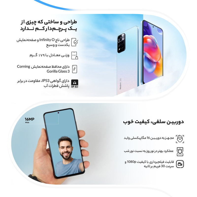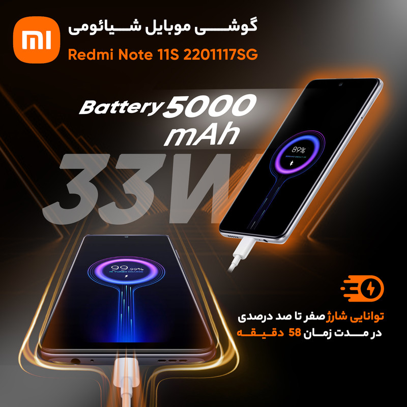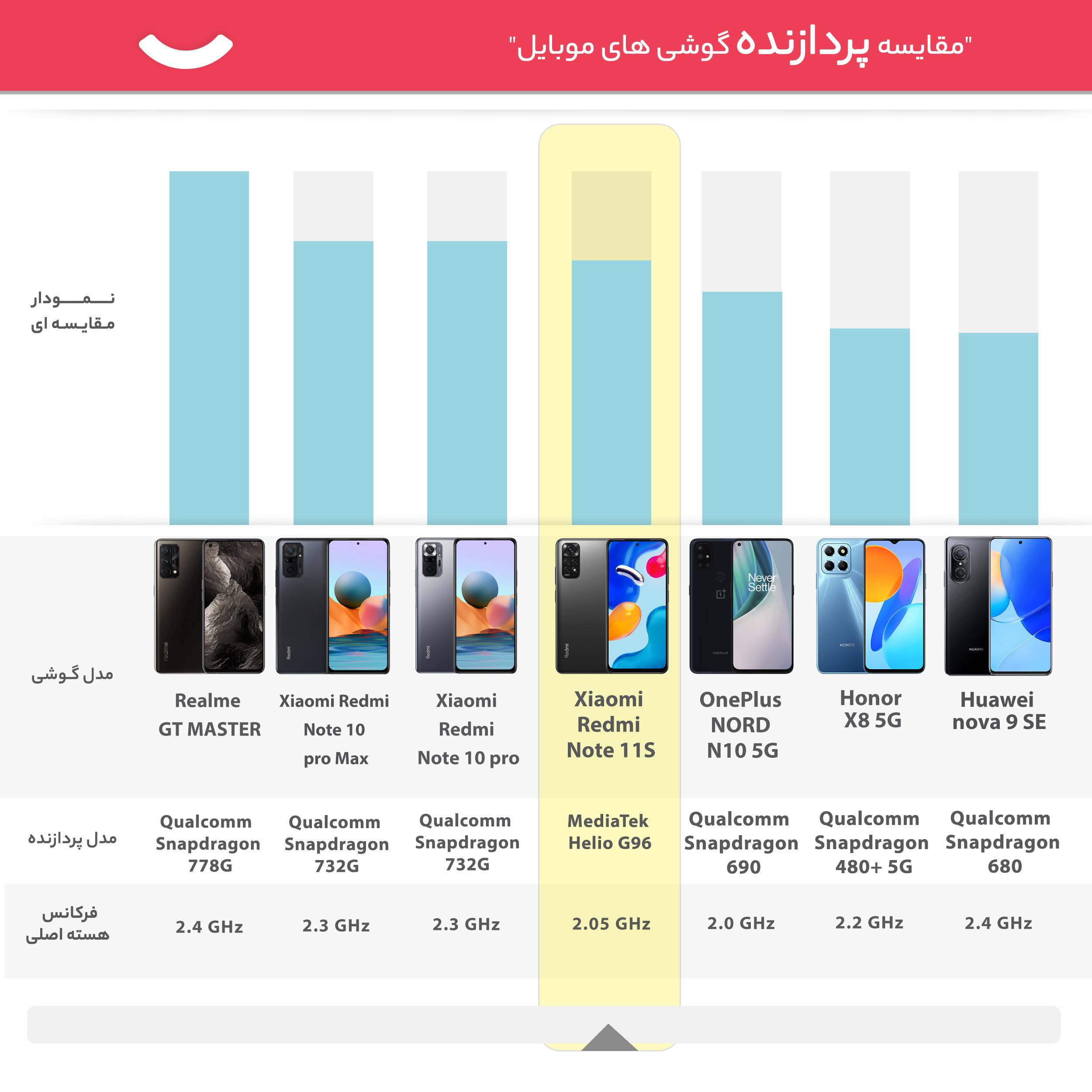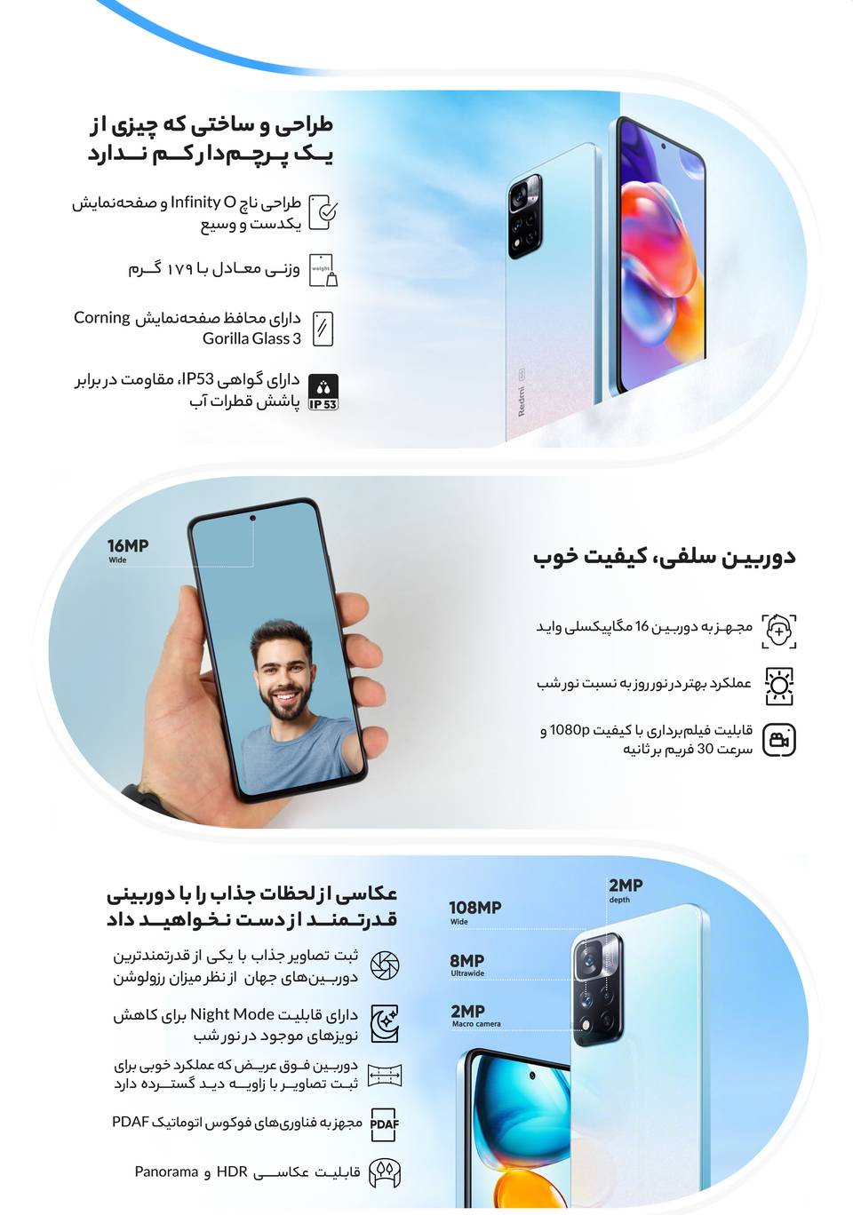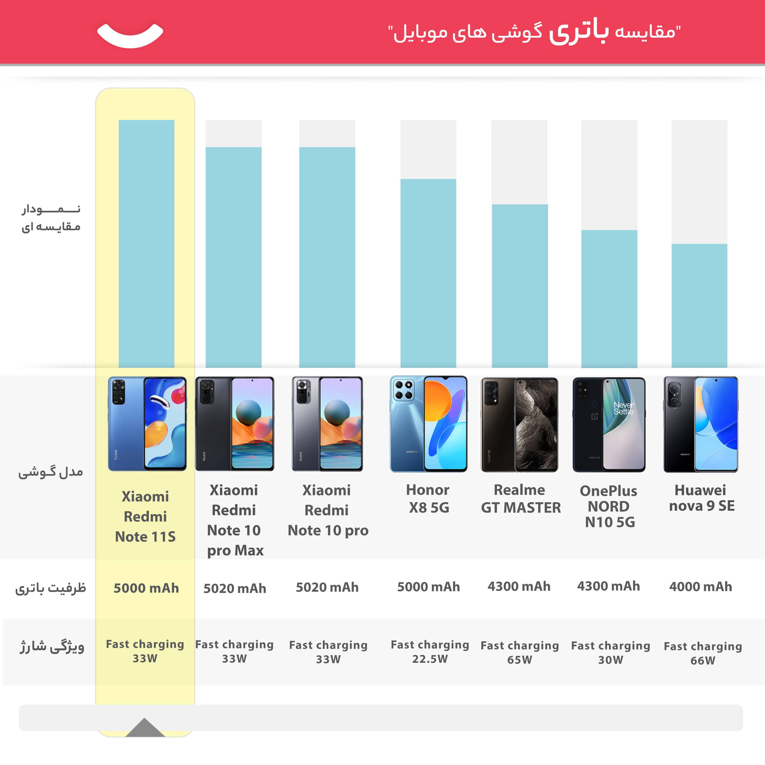 Redmi Note 11S یکی از گوشیهای هوشمند میانرده و باکیفیت شیائومی است که با بهره بردن از مشخصات فنی قدرتمند، توانایی ارائه عملکرد بسیار خوب و قابل قبولی را دارد. در نمای روبهرویی این گوشی به صفحهنمایش باکیفیت با ابعاد 6.43 اینچ و رزولوشن 1080×2400 پیکسل از نوع اولد مجهز شده است. توانایی نمایش 409 پیکسل در هر اینچ و ارائه نرخ بروزرسانی 90 هرتز سبب شده تا عملکرد بسیار خوبی را از این صفحهنمایش شاهد باشید. ناچ اینفینیتی O با بریدگی دایرهای شکل در قسمت بالایی و مرکزی صفحهنمایش هم سنسور دروبین سلفی با رزولوشن 16 مگاپیکسل را در خود جای داده است. در قسمت پشتی هم چهار سنسور دوربین برای این گوشی هوشمند میانرده در نظر گرفته شده است. یک سنسور دروبین اصلی قدرتمند با رزولوشن 108 مگاپیکسل از نوع عریض در کنار سنسور 8 مگاپیکسل از نوع فوق عریض (ultrawied) و دو سنسور با رزولوشن 2 مگاپیکسل از نوع سنجش عمق و ماکرو، سنسورهای دوربین چهارگانه Redmi Note 11S راتشکیل می دهند. در بخش مشخصات سختافزاری هم این گوشی به پردازنده میانرده Helio G96 شرکت مدیاتک مجهز شده است که توانایی ارائه عملکرد خوبی در اجرای بازی و نرمافزارهای محبوب را دارد. باتری مناسب با میزان ظرفیت 5000 میلیآمپرساعت در کنار شارژر قدرتمند با توان 33 وات مجهز به تکنولوژی شارژ سریع، از دیگر مشخصات در نظر گرفته شده برای این گوشی هوشمند میانرده هستند. لازم به ذکر است که شارژر در نظر گرفته شده توانایی شارژ صفر تا صد درصدی باتری این گوشی را در مدت زمان 58 دقیقه دارد.