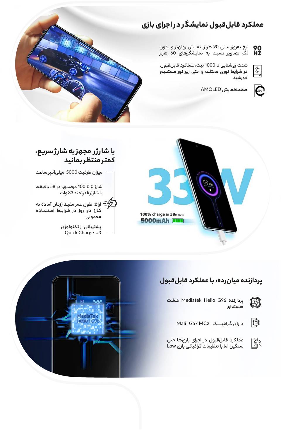 حضور پردازنده میانرده هلیو G96 شرکت مدیاتک که هشت هسته آن متشکل از دو هسته قدرتمندتر با توانایی ارائه حداکثر فرکانس کاری ۲.۰۵ گیگاهرتز در کنار شش هسته اقتصادی با صرفه انرژی کمتر و توانایی ارائه حداکثر فرکانس کاری ۲.۰ گیگاهرتز هستند، در اجرای بازیها و نرمافزارهای محبوب، عملکرد قابل قبولی دارد. اما برای بازیهایی با گرافیک بالا، مثل کالآفدیوتی موبایل و آسفالت ۹، برای اینکه شاهد اجرای بهتر و بدون لگ باشید، تنظیمات گرافیکی بازی را روی حالت Low قرار دهید. باتری با میزان ظرفیت ۵۰۰۰ میلیآمپرساعت هم به ازای هر بار شارژ صد درصدی، توانایی ارائه طول عمر مفید (زمان آماده بهکار) نزدیک به دو روز را ارائه میکند. شارژر ۳۳ واتی در نظر گرفته شده با توانایی پشتیبانی از استاندارد شارژ سریع هم توانایی شارژ صفر تا صد درصدی باتری این گوشی هوشمند میانرده را در مدت زمان ۵۸ دقیقهای دارد که عملکرد کاملا قابل قبولی است.