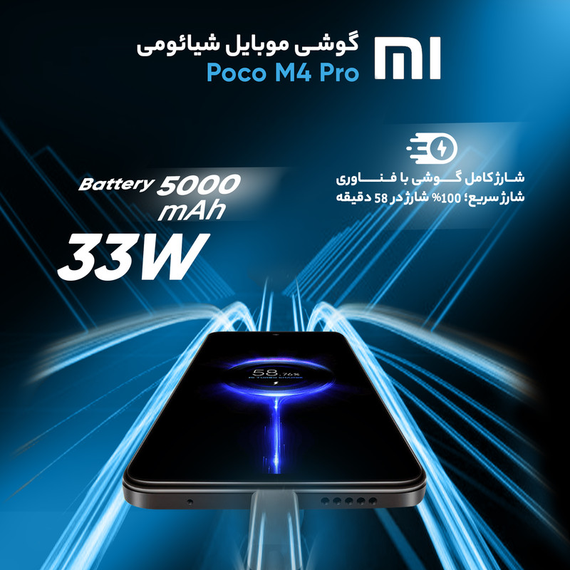 شیائومی Poco M4 Pro به پردازنده میانرده هلیو G96 شرکت مدیاتک با معماری ۱۲ نانومتری مجهز شده است. دو هسته قدرتمندتر با توانایی ارائه حداکثر فرکانس کاری ۲.۰۵ گیگاهرتز در کنار شش هسته اقتصادی با صرفه انرژی کمتر و توانایی ارائه حداکثر فرکانس کاری ۲.۰ گیگاهرتز، هشت هسته این پردازنده میانرده را تشکیل میدهند. با توجه به میزان فرکانس در نظر گرفته شده برای هستههای این پردازنده باید بگوییم که شیائومی Poco M4 Pro در اجرای بازی و نرمافزارهای کاربردی و محبوب، توانایی ارائه عملکرد قابل قبولی دارد. این گوشی حتی از پس بازیهای سنگین مثل کالآفدیوتی موبایل و آسفالت ۹ هم که گرافیک بالایی دارند برمیآید. اما باید برای اجرای این بازیهای تنطیمات گرافیکی را روی حالت LOW قرار دهید تا عملکرد بدون لگ و بهتری را شاهد باشید. باتری با میزان ظرفیت ۵۰۰۰ میلیآمپرساعت در نظر گرفته شده هم به ازای هر بار شارژ صد درصدی توانایی ارائه طول عمر مفید (زمان آماده بهکار) دو روز را در شرایط استفاده معمولی دارد. شارژر ۳۳ واتی این گوشی هم در مدت زمان ۵۸ دقیقه توانایی شارژ صفر تا صد درصدی باتری این گوشی را دارد که مدت زمان مناسب و قابل قبولی است.