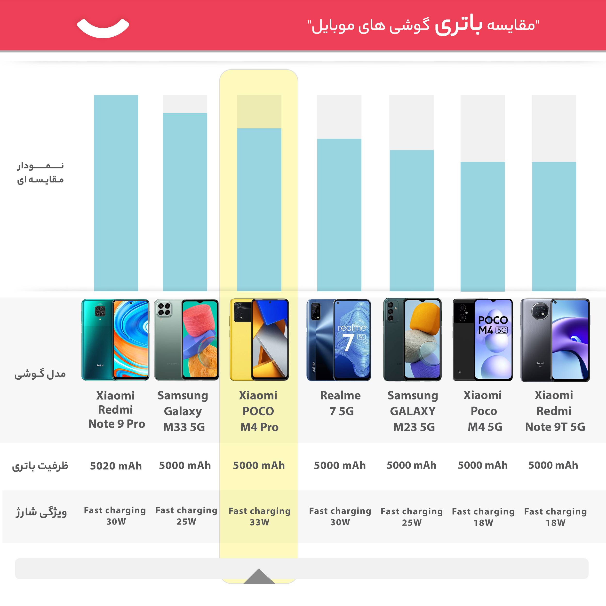 سری گوشیهای هوشمند میانرده Poco شرکت شیائومی تا به امروز توانستهاند با بهره بردن از مشخصات فنی مناسب، عملکرد خوبی را بهنمایش بگذارند. یکی از گوشیهای هوشمند میانرده این شرکت که البته قیمتی مقرون بهصرفه نیز دارد، POCO M4 Pro است. گفتنی است این گوشی در نسخه 4G روانه بازار شده و از نظر مشخصات در نظر گرفته شده تفاوتهایی با مدل 5G دارد. در نمای روبهرویی، این گوشی هوشمند میانرده به صفحهنمایشی با ابعاد 6.43 اینچ و رزولوشن 1080×2400 پیکسل از نوع امولد مجهز شده است. توانایی نمایش 409 پیکسل در هر اینچ و نرخ بروزرسانی 90 هرتز سبب شده تا شاهد عملکرد بسیار خوب و قابل قبولی از این صفحهنمایش باشید. در قسمت پشتی، یک سنسور دروبین اصلی با رزولوشن 64 مگاپیکسل از نوع عریض در کنار سنسور 8 مگایپکسل از نوع فوق عریض (ultrawide) و سنسور 2 مگاپیکسل از نوع ماکرو، سنسورهای دروبین سهگانه POCO M4 Pro را تشکیل میدهند. برای دوربین سلفی نیز سنسور با رزولوشن 16 مگاپیکسل در نظر گرفته شده است. پردازنده میانرده Helio G96 شرکت مدیاتک هم این گوشی هوشمند میانرده را همراهی میکند و توانایی ارائه عملکرد خوب و قابل قبولی را در اجرای بازی و نرمافزارهای کاربردی دارد. باتری قدرتمند با میزان ظرفیت 5000 میلیآمپرساعت در کنار شارژر با توان 33 وات و توانایی شارژ صفر تا صد درصدی در مدت زمان 58 دقیقه، از دیگر مشخصات در نظر گرفته شده برای POCO M4 Pro است. این گوشی با رم 6 گیگابایت و حافظه داخلی 128 گیگابایت روانه بازار شده است.