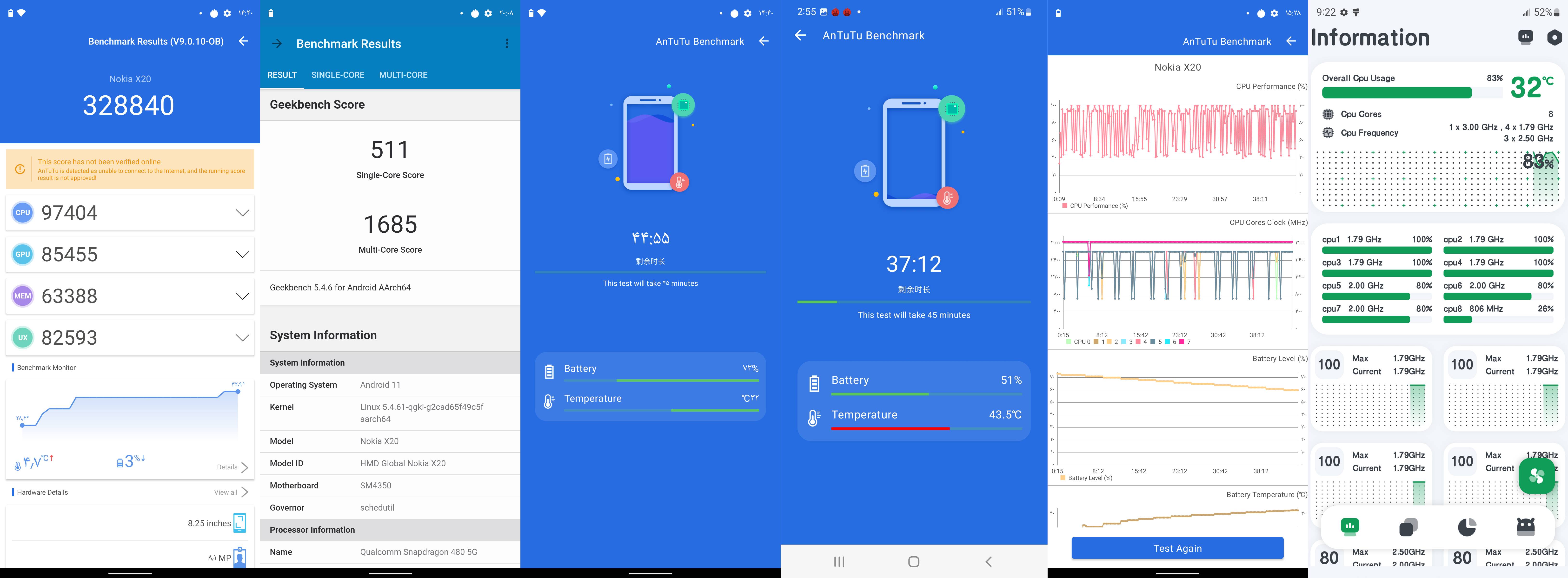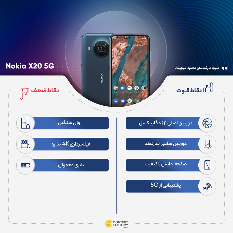 اما عملکرد پردازنده در شرایط کاری سخت نتوانست عملکرد یکسان داشته باشد و حتی شاهد کاهش ۶۰ درصدی عملکرد پردازنده بودیم. با تمام این تفاسیر و امتیازات بنچمارک باید بگوییم که نوکیا X20 حتی برای اجرای بازیهای سنگین مثل کالآفدیوتی موبایل، آسفالت ۹ و PUBG موبایل میتواند عملکرد خوبی داشته باشد. اما پیشنهاد ما به شما برای ارائه عملکرد روان و بدون لگ در چنین بازیهایی برای این گوشی هوشمند این است که تنظیمات گرافیکی بازی را روی حالت Low قرار دهید. باتری با میزان ظرفیت ۴۴۷۰ میلیآمپرساعت این گوشی هم به ازای هر بار شارژ صد درصدی توانایی ارائه طول عمر مفید (زمان آماده بهکار) نزدیک به دو روز را در شرایط استفاده معمولی دارد. در مجموع اگر بخواهیم جمعبندی داشته باشیم، باید بگوییم که نوکیا X20 به عنوان یک گوشی میانرده که البته توانایی پشتیبانی از شبکههای اینترنتی 5G را هم دارد، به صفحهنمایش باکیفیت، سنسور دوربین عریض قدرتمند و مناسب برای عکاسی نور روز، دوربین سلفی بسیار خوب برای عکاسی نور روز ، پردازندهای باتری قابل قبول مجهز شده است و میتواند یکی از بهترین گزینههای ممکن برای انتخاب در بین گوشیهای هوشمند میانرده 5G باشد.