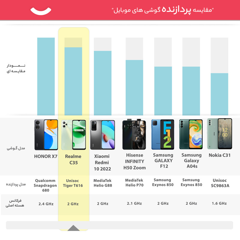 در بخش مشخصات سختافزاری هم ریلمی C35 بهخوبی تا میزان بسیار زیادی از توقعات شما را در جایگاه یک گوشی میانرده برآورده میکند. این گوشی از پردازنده Unisoc Tiger T616 بهره برده که دو هسته قدرتمندتر با توانایی ارائه فرکانس کاری ۲.۰ گیگاهرتز و شش هسته اقتصادی با صرفه انرژی کمتر و توانایی ارائه فرکانس کاری ۱.۸، هشت هسته آن را تشکیل میدهند. با توجه به مشخصات هستههای در نظر گرفته شده، باید بگوییم که ریلمی C35 در اجرای بازیهای محبوب و نرمافزارهای کاربردی عملکرد خوبی دارد. اما آیا برای بازیهای سنگین مثل کالآفدیوتی موبایل و آسفالت ۹ هم میتوان روی آن حساب باز کرد؟ در پاسخ به این سوال باید بگوییم بله و پیشنهاد میکنیم برای عملکردی روان و بدون لگ در اجرای چنین بازیهایی، تنظیمات گرافیکی بازی را روی حالت low قرار دهید.