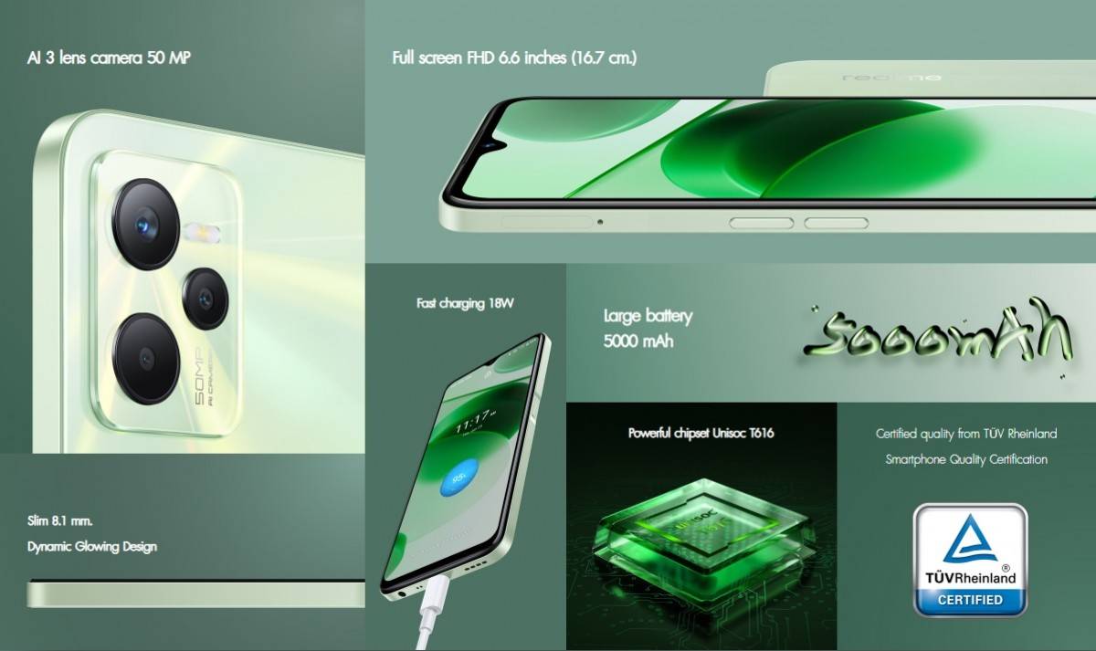 ریلمی C35 یکی از گوشیهای هوشمند میانرده و مقرون بهصرفه این شرکت است که به نسبت قیمت در نظر گرفته شده، از مشخصات فنی مناسب و قابل قبولی بهره برده است. در نمای روبهرویی این گوشی به صفحهنمایش با ابعاد 6.6 اینچ و رزولوشن 1080×2408 پیکسل از نوع IPS مجهز شده است. این صفحهنمایش توانایی نمایش 401 پیکسل در هر اینچ و حداکثر روشنایی 600 نیت را دارد. برای طراحی صفحهنمایش هم از ناچ واتردراپ استفاده شده است که بریدگی قطرهای شکل ناچ در قسمت بالایی و مرکزی صفحهنمایش، سنسور دوربین سلفی با رزولوشن 8 مگاپیکسل را در خود جای داده است. در قسمت پشتی هم طراحی جالب و متفاوتی برای قرارگیری سنسورهای دوربین در نظر گرفته شده است. یک سنسور دوربین اصلی با رزولوشن 50 مگاپیکسل از نوع عریض (wide) با گشودگی دریچه دیافراگم f/1.8 در کنار سنسور 2 مگاپیکسل از نوع ماکرو برای ثبت تصاویر از فاصله نزدیک و سنسور 0.3 مگاپیکسل از نوع سنجش عمق، سنسورهای دوربین سهگانه ریلمی C35 را تشکیل میدهند. در بخش مشخصات سختافزاری هم این گوشی به پردازنده میانرده Unisoc Tiger T616 است که برای اجرای بازیهای محبوب و نرمافزارهای کاربردی، میتواند عملکرد مناسب و قابل قبولی را داشته باشد. حضور باتری با میزان ظرفیت 5000 میلیآمپرساعت هم سبب شده تا به ازای هر بار شارژ صد درصدی، توانایی ارائه طول عمر مفید (زمان آماده بهکار) بسیار خوب و کاملا قابل قبولی را دارد. پشتیبانی از فناوری شارژ سریع با توان 18 هم از دیگر قابلیتهای در نظر گرفته شده برای این گوشی مقرون بهصرفه است.