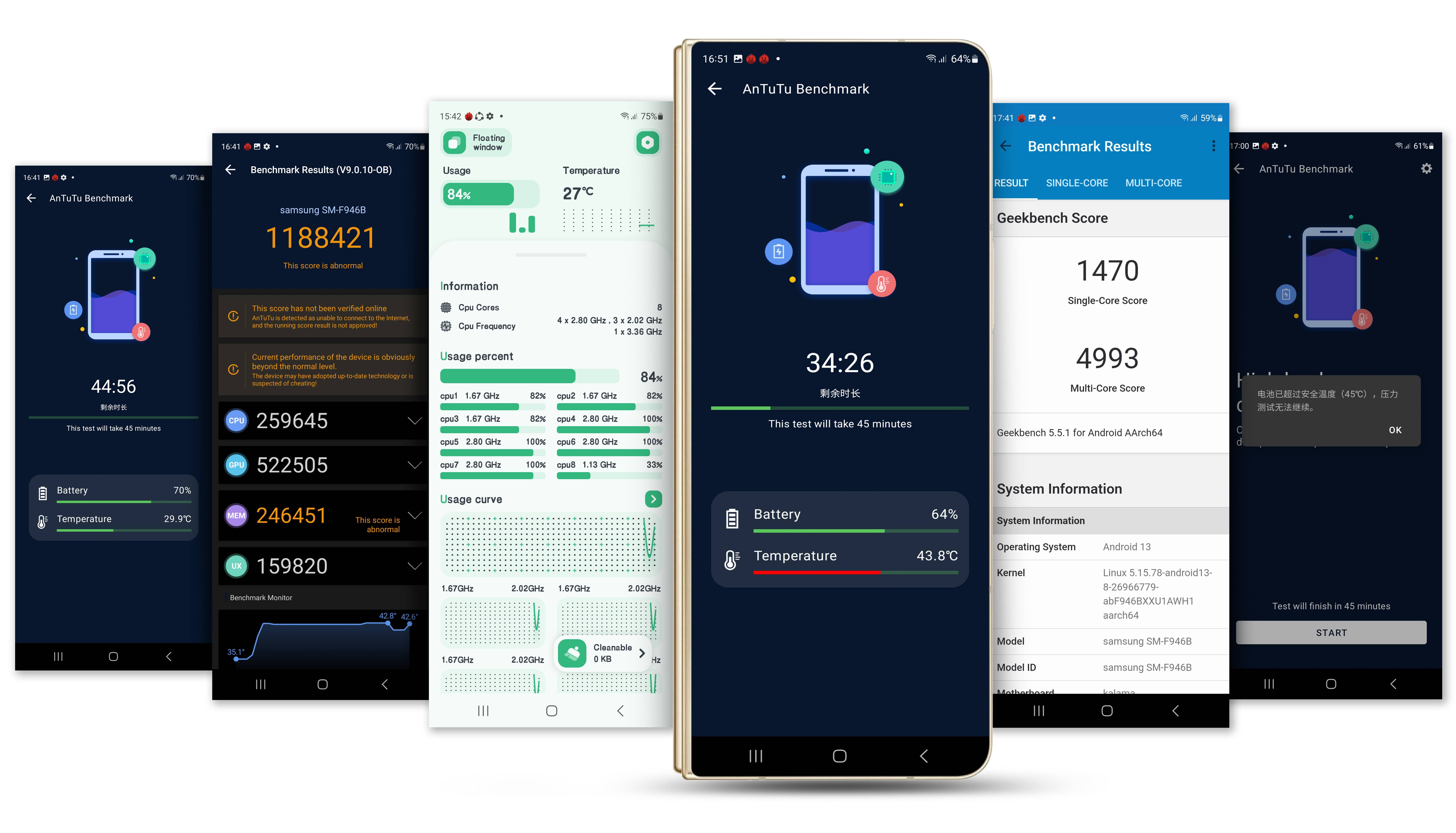 گوشی تاشوی Galaxy Z Fold5 به پردازنده اسنپدراگون 8 نسل 2 مجهز شده است. این پردازنده برای پرچمداران سامسونگ با اورکلاک کارخانهای مواجه است. نهایت فرکانس هسته اصلی در این تراشه برابر با 3.36 گیگاهرتز است در حالی که نمونههای استاندارد فرکانس 3.2 یا به طور دقیق 3.19 گیگاهرتز را ارائه میکنند. یک پردازنده گران قیمت 8 هستهای که با لیتوگرافی 4 نانومتری ساخته شده است. این تراشه به اندازه کافی قدرتمند و جذاب است تا شما را با توان پردازشی خود شگفتزده کند. در تستهایی که انجام دادیم امتیاز 1470 در تک هستهای و 4993 در چند هستهای Geekbench به دست آمد. مسئله مهمی که در پرچمداران سامسونگ وجود دارد این است که برای حفظ دمای پایدار گوشی، زیر بار کاری پردازنده بخش زیادی از توان خود را محدود میکند. این محدود شدن همیشه نیست. زمانی که بار کاری بیش از اندازه طولانی شود، فرکانس کاری کم میشود تا دما پردازنده کاهش یابد.