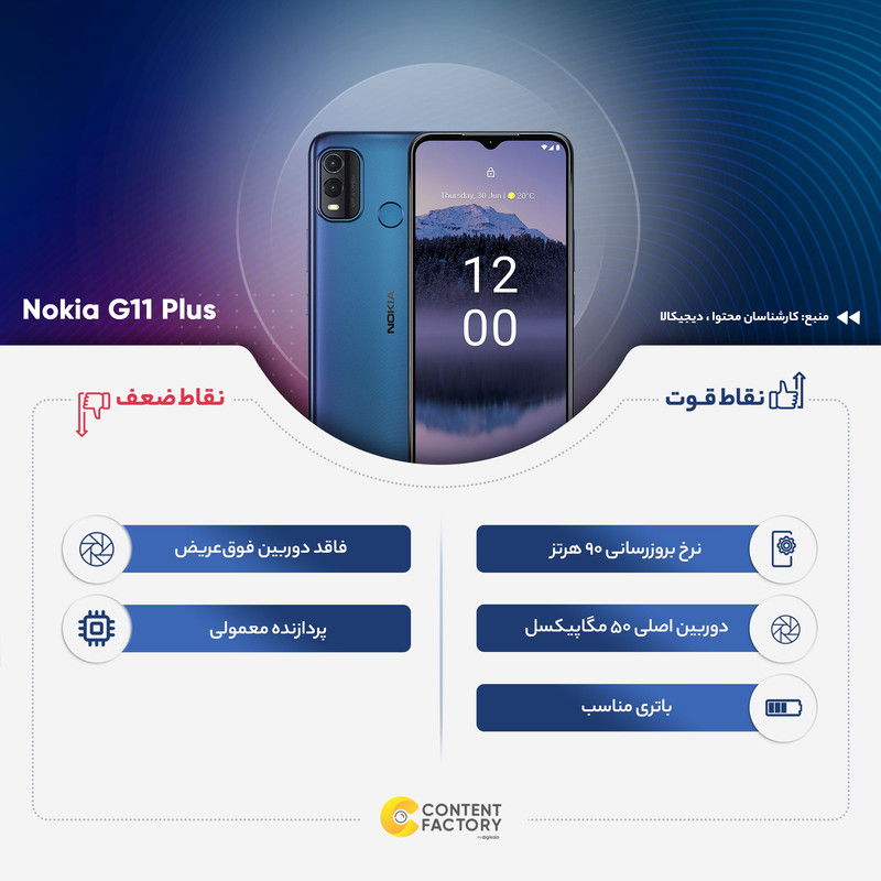 اما یکی دیگر از برگهای برنده G11 Plus به گفته نوکیا، باتری ۵۰۰۰ میلیآمپرساعت آن است. باتری که به گفته نوکیا به ازای هر بار شارژ صد درصدی، توانایی ارائه طول عمر مفید (زمان آماده بهکار) بیش از دو روز را در مصرف عادی دارد. البته در حالت استفاده سنگین (فعال بودن دیتا، پخش ویدیو و اجرای بازی)، این گوشی میتواند طول عمر مفید یک روز را به ازای هر بار شارژ صد درصدی ارائه کند. در مجموع باید بگوییم که نوکیا G11 Plus با بهره بردن از صفحهنمایش روان ۹۰ هرتز، سنسور دوربین عریض قدرتمند ۵۰ مگاپیکسل، پردازنده مناسب و باتری قدرتمند، میتواند یکی از گزینههای انتخاب بسیار خوب در بین گوشیهای اقتصادی باشد.