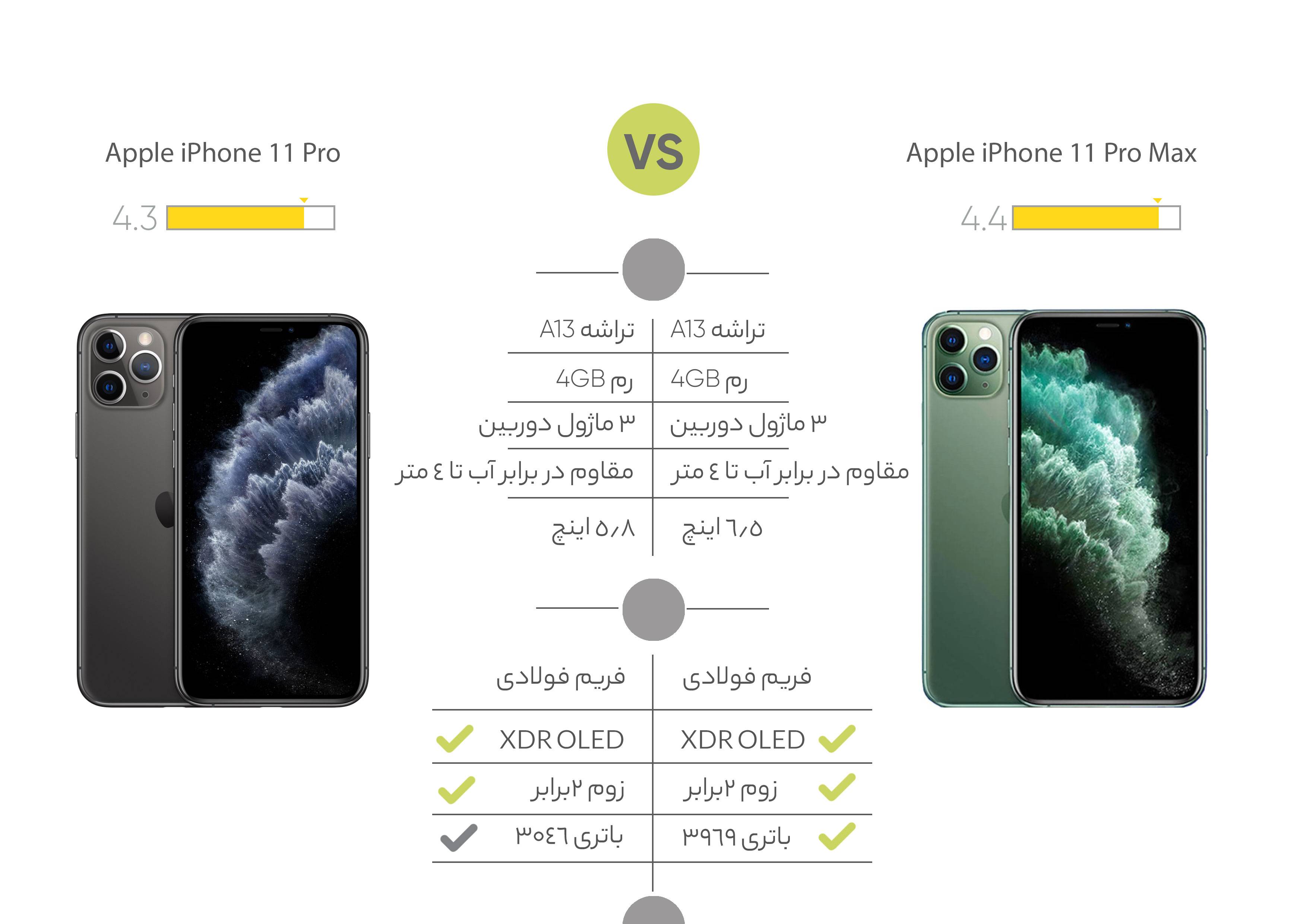 مانند سالهای اخیر، ماه سپتامبر سال 2019 زمان برگزاری کنفرانس معرفی محصولات جدید اپل بود که در آن گوشی همراه «iPhone 11 Pro Max» همراه با دو مدل دیگر از گوشیهای این شرکت یعنی «iPhone 11» و «iPhone 11 Pro» معرفی شد. اپل برای ویژگیها و طراحی کلی این گوشی از همان فرمول چند سال اخیرش استفاده کرده است. نمایشگر آیفون 11 Pro Max به پنل Super Retina مجهز شده است تا تصاویر بسیار مطلوبی را به کاربر عرضه کند. این نمایشگر رزولوشن بسیار بالایی دارد؛ بهطوریکه در اندازهی 6.5اینچیاش، حدود 458 پیکسل را در هر اینچ جا داده است که دقیقاً با تراکم پیکسلی iPhone XS Max برابر است. قاب پشتی آیفون جدید هم از شیشه ساخته شده تا هم گوشی مشکل آنتندهی نداشته باشد و هم امکان شارژ بیسیم باتری در این گوشی وجود داشته باشد. البته قابی فلزی این بدنه شیشهای را در خود جای داده است. این بدنهی زیبا در مقابل خطوخش مقاومت زیادی دارد؛ پس خیالتان از این بابت که آب و گردوغبار بهراحتی روی آیفون 11 Pro تأثیر نمیگذارد، راحت باشد. علاوهبراین لکه و چربی هم روی این صفحهنمایش باکیفیت تأثیر چندانی ندارند اما این هم پایان کار نیست، آیفون جدید میتواند به مدت 30 دقیقه در عمق 4 متری آب دوام بیاورد. تشخیص چهره با استفاده از دوربین جلو دیگر ویژگی است که در آیفون جدید اپل به کار گرفته شده است. اما جالبترین و واضحترین تفاوت در این محصول جدید، دوربینهایی است که این بار به شکل سهگانه در قاب پشتی جا خوش کردهاند. سه دوربین با سنسورهای 12مگاپیکسلی عکسهایی با کیفیتِ کاملاً رضایتبخش را به کاربر هدیه میدهد. دو دوربین که یکی از آنها دوربین مدت پروازی است هم دیگر بهروزرسانی در آیفون 11 پرو مکس است. قابلیت اتصال به شبکههای 4G، بلوتوث نسخهی 5، نسخهی 13 از iOS دیگر ویژگیهای این گوشی هستند. ازنظر سختافزاری هم این گوشی از تراشهی جدید A13 بهره میبرد که تا بتواند علاوه بر کارهای معمول، از قابلیتهای جدید واقعیت مجازی که اپل این روزها روی آن تمرکز خاصی دارد، پشتیبانی کند. پرچمدار جدید اپل به باتری 3969 میلیآمپرساعتی، فناوری شارژ سریع PD2.0، فناوری شارژ بیسیم و استاندارد صوتی دالبی هم مجهز شده است.