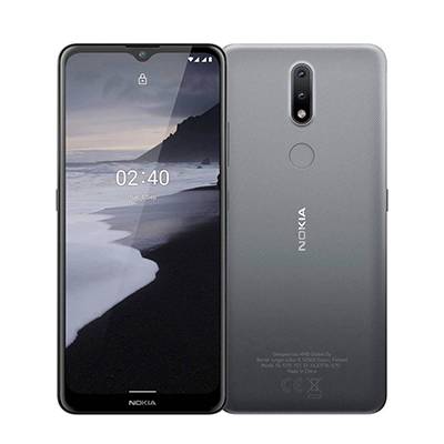 طراحی نمای روبهرویی این گوشی هوشمند مشابه با بسیاری از گوشیهای میان رده این شرکت و حتی شرکتهای دیگر میباشد. در قسمت جلویی از طراحی ناچ محبوب و بسیار زیبای واتردراپ یا همان قطرهای استفاده شده است. بریدگی قطرهای شکل ناچ در قسمت بالایی و مرکزی صفحهنمایش، سنسور دوربین سلفی را در خود جای داده است. تلاش نوکیا برای کم کردن حاشیه سبب شده تا نزدیک به 81 درصد از نمای روبهرویی را صفحهنمایش به خودش اختصاص دهد. در قسمت پشتی هم شاهد قرار گیری دو سنسور دوربین میباشیم که با چیدماتی ستونی در کنار یکدیگر قرار گرفتهاند. در این قسمت قابلیت امنیتی و بسیار پرکاربرد حسگر اثر انگشت هم قرار گرفته که میتواند عملکرد بسیار خوب و سریعی در زمینه قفل گشایی صفحهنمایش داشته باشد. متریال پلاستیکی و باکیفیت هم وزن 195 گرمی را برای این گوشی هوشمند بههمراه داشته است. وزن 195 گرمی نه تنها در استفادههای طولانی مدت هیچ خستگی برای دست کاربرد نخواهد داشت، بلکه احتمال افتادن در حین کار کردن با این گوشی هوشمند را تا میزان قابل توجهی کاهش میدهد. نوکیا 2.4 از استانداردهای ضدآب پشتیبانی نمیکند و که البته نمیتوان از چنین گوشی هوشمند میانرده با چنین قیمت ارزانی توقع پشتیبانی از استانداردهای ضدآب را داشت.