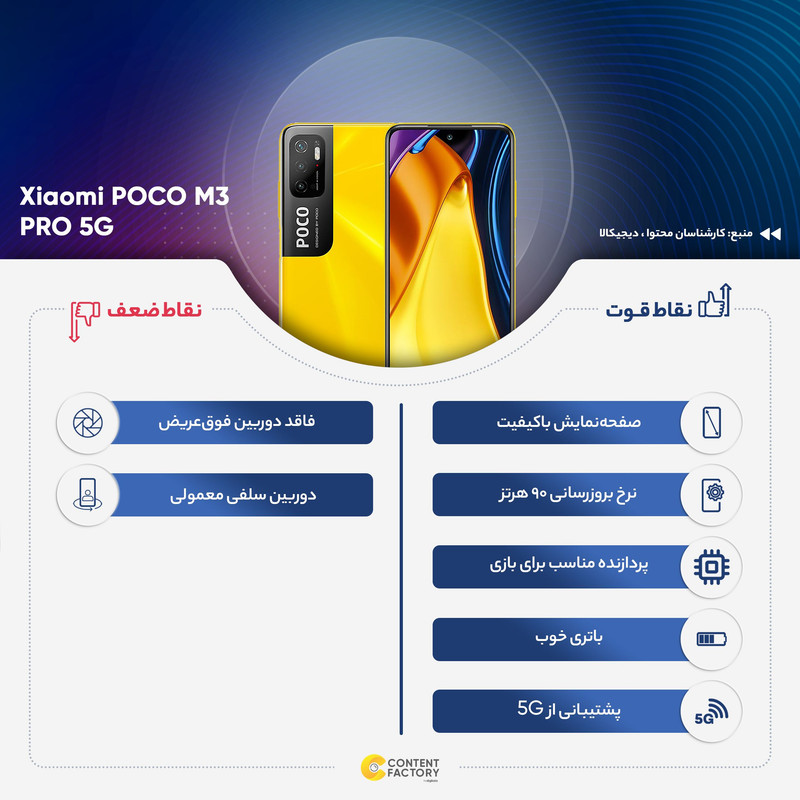 گوشی موبایل شیائومی مدل POCO M3 PRO 5G M2103K19PG دو سیم‌ کارت ظرفیت 64 گیگابایت از جمله سری محصولات برند شیائومی است. این محصول دارای ساختاری متوازن و خوش‌ساخت بدون پشتیبانی از تکنولوژی 5G در تاریخ نوامبر 2021 روانه بازار شده است. این محصول از فریم پلاستیکی ساخته شده است که قاب جلو شیشه‌ای جلوه ویژه‌ای به این مدل بخشیده است. صفحه‌نمایش گوشی موبایل شیائومی مدل POCO M3 PRO دو سیم‌ کارت ظرفیت 64 گیگابایت در اندازه 6.5 منتشر شده است. این صفحه‌نمایش کاملاً تمام‌صفحه است و در بالا وسط اثری از بریدگی یا حفره دوربین سلفی وجود دیده می‌شود. دوربین سلفی این محصول دارای حسگر 8 مگاپیکسلی است .صحفه‌نمایش گوشی موبایل شیائومی مدل POCO M3 PRO با استفاده از فناوری Corning Gorilla Glass 3 در برابر خط‌وخش و صدمات احتمالی محافظت می‌شود. ویژگی دیگر Poco M3 مجهز شدن به حسگر اثرانگشت در زیر کنار گوشی که نشان از بالارده بودن محصول دارد. گفتنی است 3 دوربین که سنسور اصلی آن 48 مگاپیکسلی است در قسمت پشتی این گوشی جا خوش کرده‌اند. این دوربین‌ها قادر هستند ویدئوی Full HD را ثبت و ضبط کنند. دوربین‌ سلفی این محصول هم به سنسوری 8 مگاپیکسلی مجهز شده است. بلوتوث نسخه 5.0، نسخه 10 سیستم عامل اندروید و باتری شگفت‌انگیز 5000 میلی‌آمپرساعتی از دیگر ویژگی‌‌های این گوشی موبایل شیائومی جدید هستند.