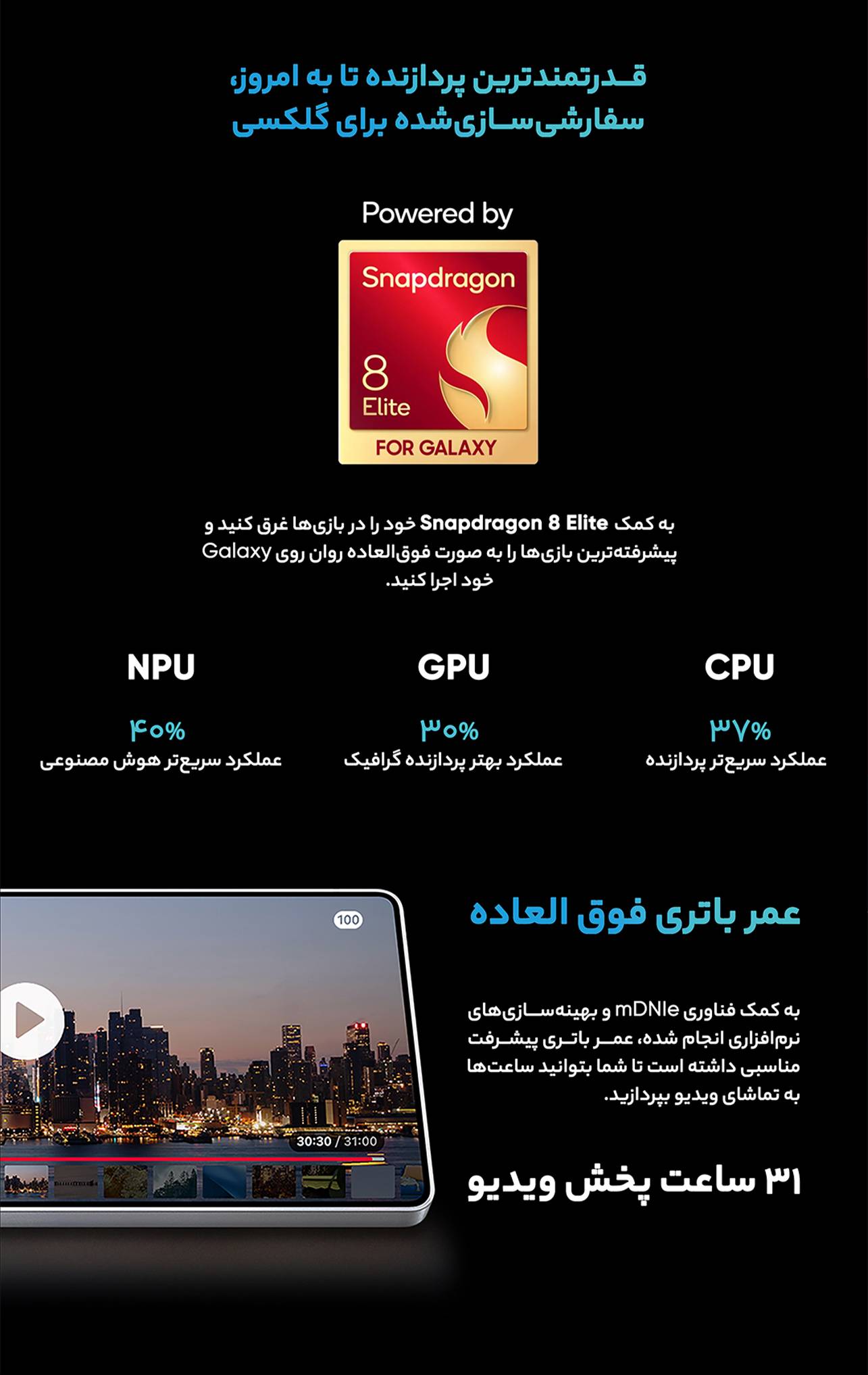 | ویژگیهای کلیدی | دارای استاندارد IP68 و مقاوم در برابر نفوذ آب (تا عمق 1.5 متری به مدت 30 دقیقه) / مجهز به قلم لمسی / پشتیبانی از 7 آپدیت نرمافزاری (طبق گفته کمپانی سامسونگ) / پشتیبانی از سیستم جدید Samsung DEX / مجهز به فناوری Circle to search |