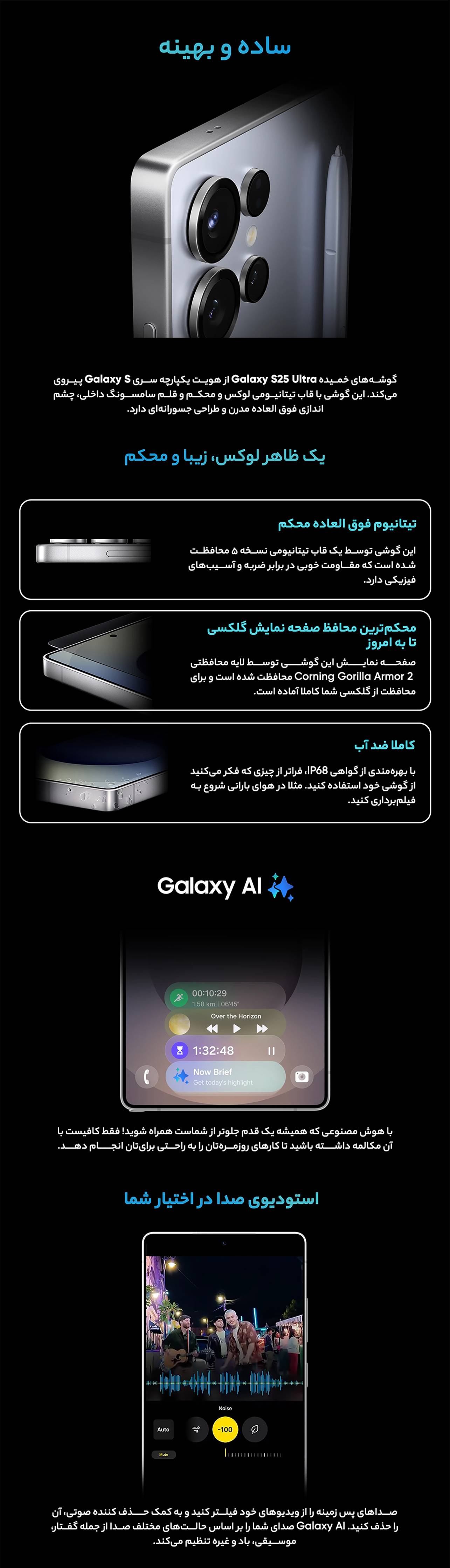 این گوشی با استفاده از گوریلا گلس آرمور 2 در جلوی دستگاه و پشت آن و همچنین فریم تیتانیوم درجه 5، استحکام بسیار بالایی دارد. همچنین، استاندارد IP68 برای مقاومت در برابر آب و گرد و غبار تا عمق 1.5 متر به مدت 30 دقیقه، به آن امکان میدهد که در شرایط مختلف محیطی نیز بدون نگرانی از آسیب دیدن، از آن استفاده کنیدنآببببب. این ویژگیها باعث شده است تا S25 Ultra علاوه بر داشتن طراحی جذاب، در برابر آسیبها نیز مقاوم باشد.
