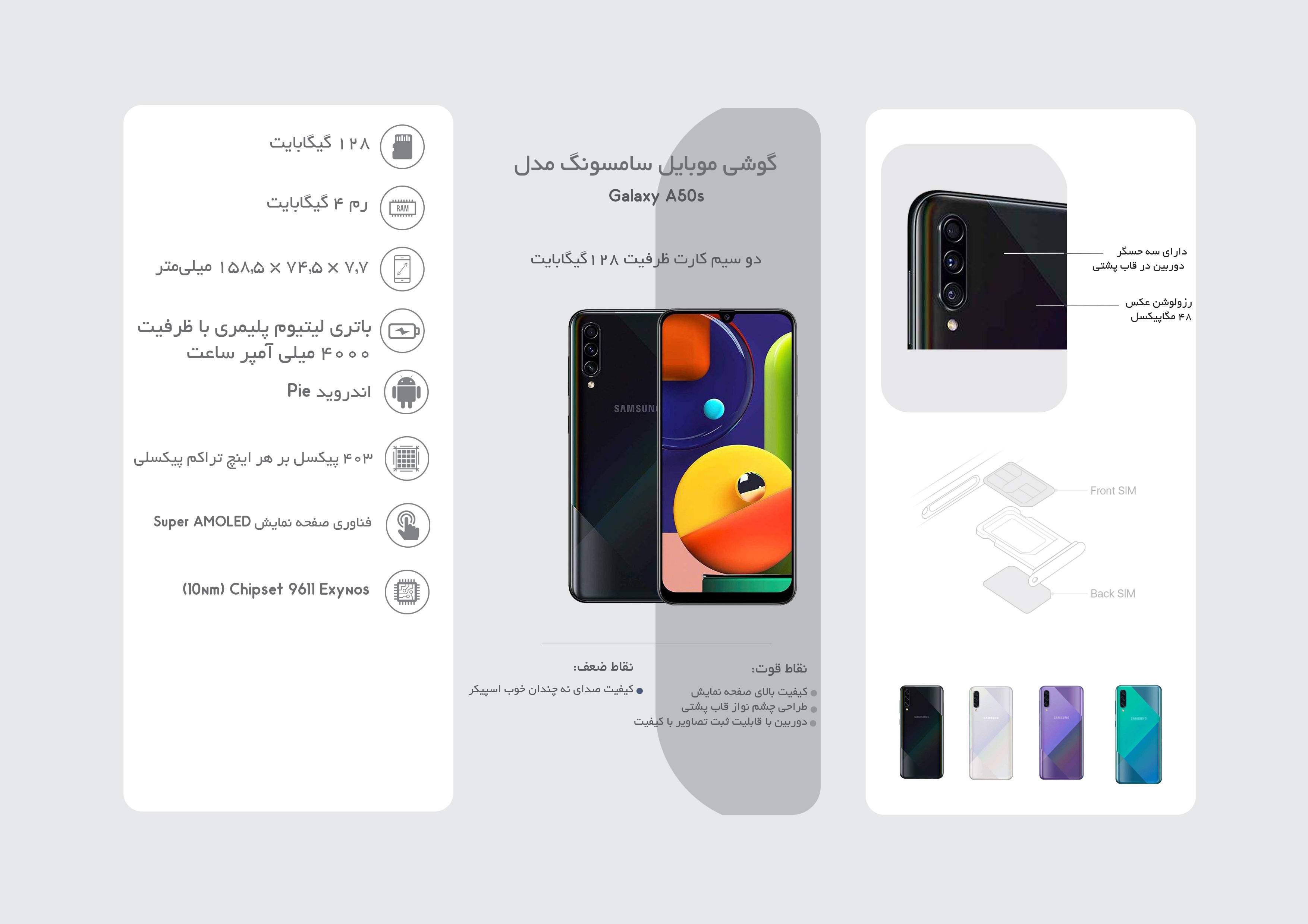 گوشیهای سری A شرکت سامسونگ از گوشیهای میانرده این شرکت هستند. اولین گوشی تولید شده این سری گوشیهای موبایل سامسونگ، Galaxy Alpha بود که در سال 2014 روانه بازار شد. پس از آن اولین نسل گوشیهای موبایل A3 و A5 در دسامبر سال 2014 معرفی شدند. گوشیهای موبایل سری A سامسونگ، ویژگیهای خاص و تجملاتی گوشیهای سری S را ندارند. این سری از گوشیهای سامسونگ را میتوان رقبای اصلی برای محصولات مقرونبهصرفه شرکتهایی مانند هوآوی و شیائومی دانست. شرکت سامسونگ با ساخت گوشی موبایل مدل A50s بار دیگر سعی کرده است تا سهم بازار خود را در گوشیهای میان رده حفظ کند. گوشی A50s شباهت زیادی به گوشی A50 دارد اما با بهبودهایی هم همراه شده است؛ شرکت سامسونگ در این محصول خود، دوربین های اصلی قاب پشتی و سلفی خود را تغییر داده و از لنزها با رزولوشن بالاتری استفاده کرده است. پردازنده Exynos هم در این گوشی کمی جدیدتر شده و در حالی که طراحی آن تغییر زیادی نداشته سامسونگ سعی کرده است تا رنگ و لعاب بیشتری به آن بدهد. به طور کلی A50s با گذشت 6 ماه از معرفی A50، با آپدیت های کوچکی هم همراه شده است.