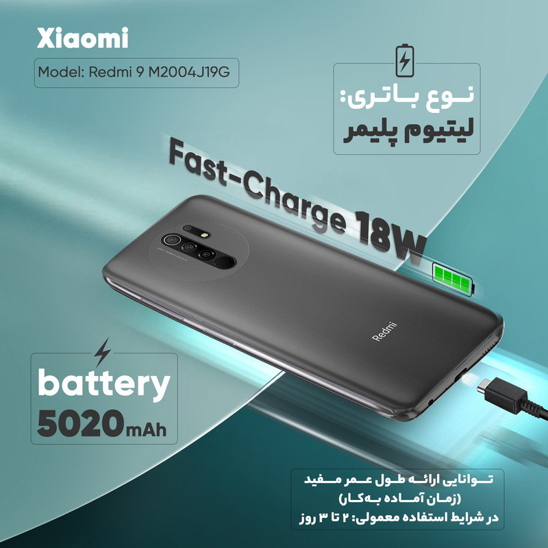 شیائومی در زمینه باتری در بازار گوشی موبایل دارای اعتبار و قدرت است. گوشی موبایل شیائومی Redmi 9 دو سیم‌ کارت ظرفیت 32 گیگابایت یک باتری لیتیوم-پلیمر با ظرفیت 5020 میلی‌آمپرساعت دارد. این میزان ظرفیت باتری فوق‌العاده است و می‌تواند این گوشی را به محصولی شگفت‌انگیز از لحاظ قدرت و ماندگاری شارژ باتری در بین محصولات میان‌رده بازار تبدیل کند. باتری در شرایط استفاده معمولی، می‌تواند ۲ الی ۳ روز گوشی را روشن نگه دارد. با این حال تماشای فیلم با صفحه نمایش کاملا روشن و بازی کردن، مخصوصا بازی‌های سبک، مصرف باتری را بالا می‌برد و اینجا است که مشاهده می‌کنید باتری زودتر تمام می‌شود. این باتری استفاده شده در Redmi 9 لیتیوم-پولیمری است که جدیدترین نوع باتری برای استفاده در گوشی‌ها است.