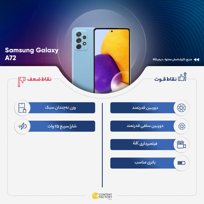 گوشیهای سری A شرکت سامسونگ از گوشیهای میانرده این شرکت هستند. در واقع سامسونگ با تولید سری گوشیهای A، تولیدکنندگان چینی مانند هوآوی و شیائومی را در گوشیهای میانرده به مبارزه طلبیده است. سامسونگ با به کارگیری صفحهنمایشهای Super AMOLED در این سری از گوشیهای خود، رقیبان خود را به چالش جدیای کشیده است و باعث شده تا کاربران با صرف هزینهای که برای یک گوشی میانرده پرداخت میکنند صاحب گوشی با نمایشگر فوقالعاده شوند. سامسونک رده Aهای خود را در اصل برای کسانی ساخته است که میخواهند گوشیای داشته باشند که بتوانند با آن کارهای متفاوتی انجام دهند ولی هزینه کمتری کنند. سامسونگ این بار گوشی A72 را راهی بازار کرده است. انتظار میرود سامسونگ سری A رضایتمندی بیشتری را کسب کند. البته مواردی درگوشی A72 با بهبود همراه است؛ ازاینرو میتوان گفت گوشی A72 نسخه ارتقاء یافته از گوشی A71 است. حفره کوچکتر روی صفحهنمایش، رزولوشن بیشتر، چیپست جدیدتر و تعداد دوربینهای بیشتر روی قاب پشتی تغییراتی است که نسبت به گوشی A71 داشته است. شرکت سامسونگ با ساخت گوشی موبایل مدل A72 بار دیگر سعی کرده است تا سهم بازار خود را در گوشیهای میان رده حفظ کند.